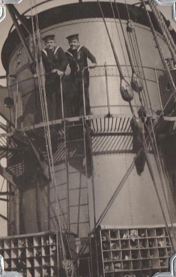 (1) Roy Bezant and Thomas Carson on the walkway around the funnel on HMS Courageous (2) Admiral's flag on HMS Courageous (3) Thomas Carson sitting on the flag locker on HMS Courageous (4) Aircraft carrier HMS Furious, Rosyth, Scotland (5) Battleships HMS Malaya and HMS Warspite and the Firth of Forth Railway Bridge, Rosyth, Scotland. HMS Courageous in the foreground (6) Thomas Carson, Joe Marriott and Barnes on HMS Courageous, Invergordon, Scotland (7) 10-inch Sperry signal projector on HMS Courageous