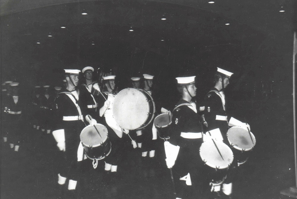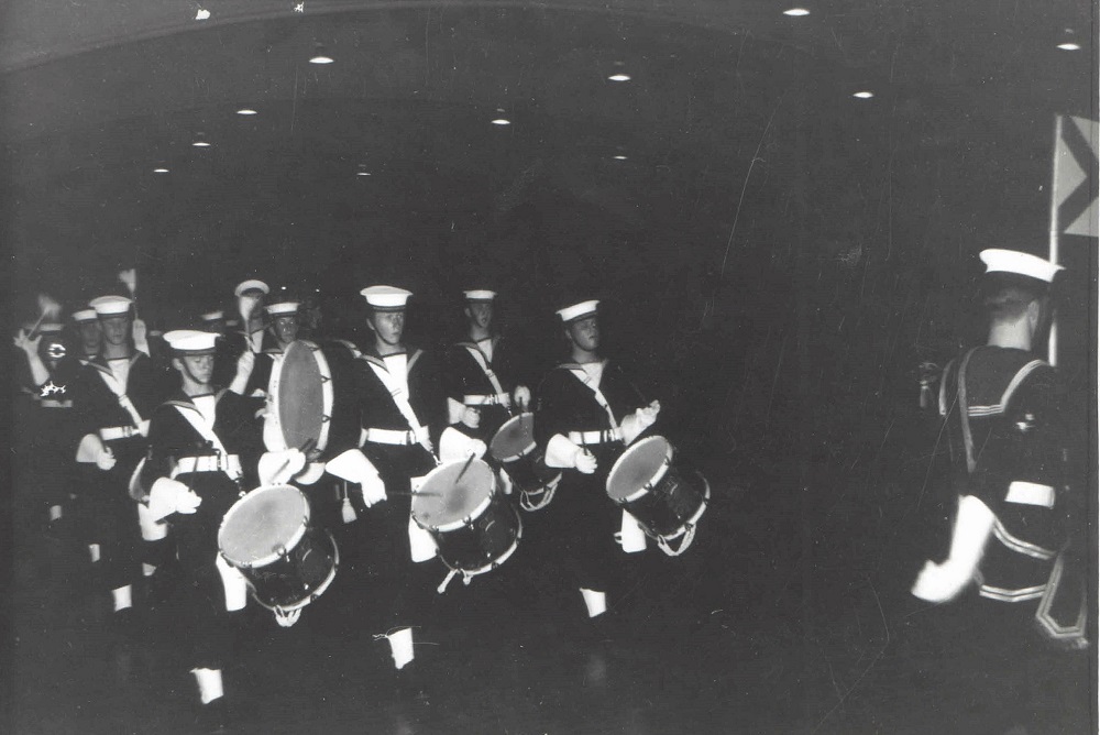 Combined RCNR/Sea Cadet band rounding the NW corner of the drill hall of DONNACONA in a May 1963 Parade. Gary Medford (bottom photo) on snare drum left of the base drum