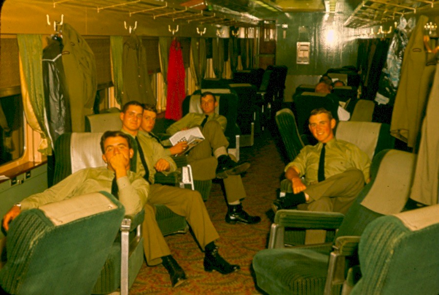 (GM-DON051) UNTDs from HMCS DONNACONA heading to Hamilton, ON to crew Porte St Jean and Porte St Louis - May 1965 Art Kuiper on left reading newspaper, Gary Medford on right