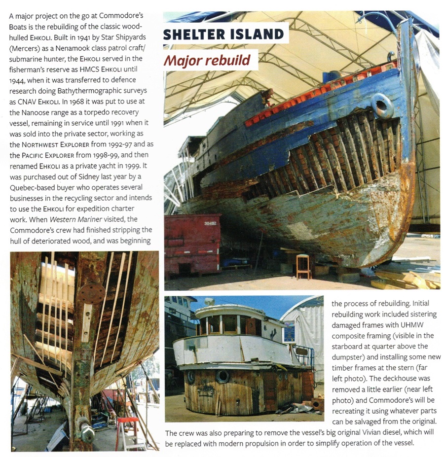 Built at the Star Shipyards (Mercer's) Ltd., New Westminster, BC, EHKOLI (meaning Whale in Chinook) was one of 6 vessels built for the Fisherman's Reserve as the Nenamook class patrol craft, to replace some of the less suitable vessels. Using blueprints from a redesign of large seiners, the interiors were adjusted to suit a crew of 18. Built for the Fisherman's Reserve, they were equipped for ASW and were armed with depth charges, ASDIC and small arms. On 08 Feb 1944 a RCAF Hurricane crashed near EHKOLI's patrol area. EHKOLI was order to search for the pilot. The pilot had escaped the aircraft but did not make it to his raft. When found, he was deceased. His body was recovered and transported back to shore by EHKOLI. On 24 Jan 1944, EHKOLI transferred over from the Fisherman's Reserve and became a defence research vessel. During the war, EHKOLI was fitted as a Bathythermographic vessel. In 1950, as a CNAV, her equipment was upgraded and she continued on in this role providing new charts for the navy. In 1968 CFAV EHKOLI was assigned to the USA for us at the Nanoose Range. She was refitted and entered service at the Nanoose Range in 1970. In 1991 she was declared surplus and removed from service. Soon sold, she was renamed Northwest Explore and later Pacific Spirit I. Resold in 1999 she once gain was named EHKOLI. As of March 2015, she is still in service and was photographed at Sooke, BC