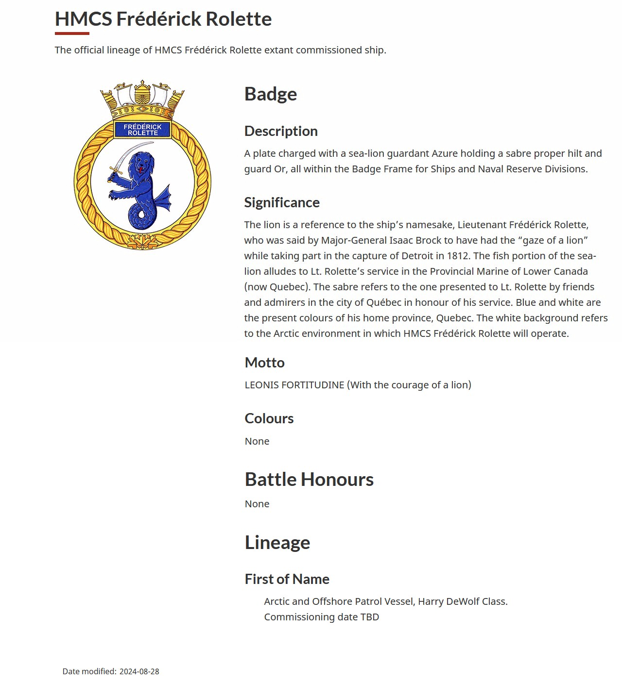 (FRL001) The official lineage of HMCS FRÉDÉRICK ROLETTE