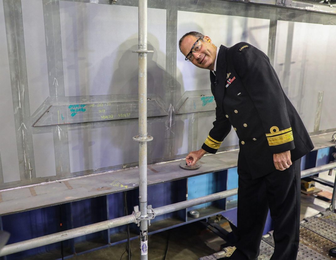 The official keel laying of HMCS FRÉDÉRICK ROLETTE - 29 Jun 2022 (FRL002) The silver $5 coin to be placed on the ship's keel. (FRL003) Rear Admiral Santarpia placing the coin to be welded on the keel of HMCS Frédérick Rolette – the 5th Arctic and Offshore Patrol Ship for the Royal Canadian Navy (FRL004) Keel of the future HMCS Frédérick Rolette (AOPS 5) immediately behind the group. In the background is the bow of the future HMCS William Hall (AOPS 4) L to R: Ross Langley, Vice Chairman of Irving Shipbuilding Eric Theriault, Welder at Halifax Shipyard Rear Admiral Brian Santarpia CPO1 Alena Mondelli