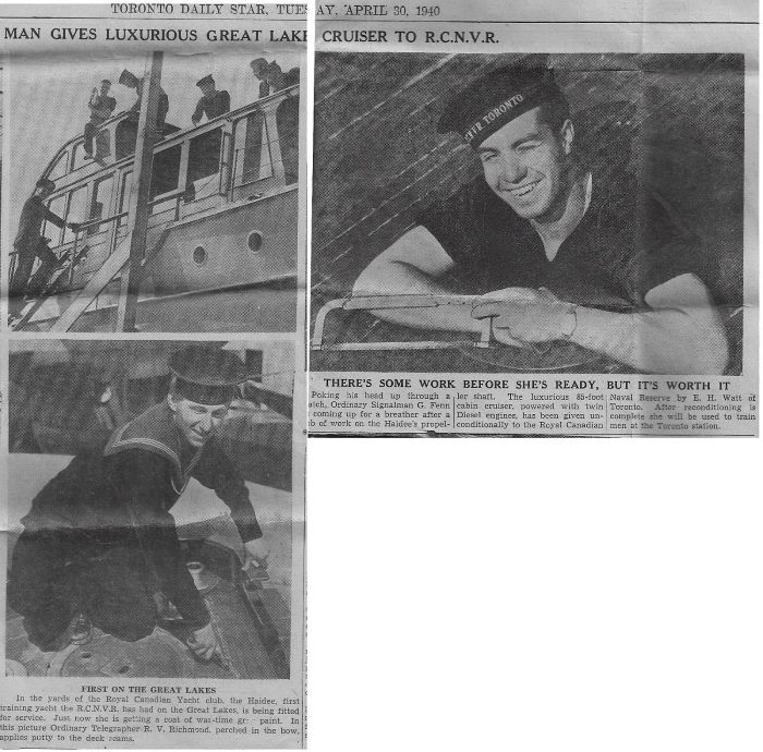 Newspaper article on paint and prep-work being done on the RCN's newly acquired training vessel HAIDEE Toronto Daily Star, 30 Apr 1940 Click on the above article to view a larger image From the collection of Robert V. Richmond Courtesy of Bob Richmond