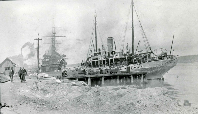 CSS ACADIA loading coal at the Naval Dockyard in Halifax in preparation for her first Arctic expedition. HMCS NIOBE in the centre, background Source/credit: Naval Museum of Halifax MP28.36.75