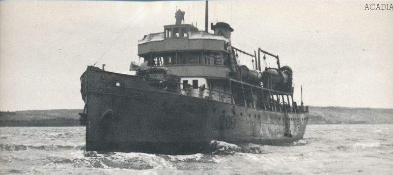 Acadia, a Dominion government hydrographic survey ship, was commissioned as a patrol vessel from 16 Jan 1919 to Mar 1919 and carried out A/S Patrol in the Bay of Fundy, off the south shore of Nova Scotia and in the Gulf of St. Lawrence. She then resumed survey duty until the outbreak of the Second World War when she was commissioned on 02 Oct 1939, first service as training ship for HMCS STADACONA, later patrolling the Halifax approaches from May 1940, to Mar 1941. She also occasionally acted as close escort from small convoys between Halifax and Halifax Ocean Meeting Point. After refit in 1941, she served as a training ship at Halifax for A/A and DEMS (Defensively Equipped Merchant Ship) gunners and, in Jun 1944, went to HMCS CORNWALLIS as gunnery training ship. Paid off on 03 Nov 1945, she was returned to the Dominion government. Acadia retired from service on 28 Nov 1969, to become a museum ship at the Bedford Institute in Dartmouth, N.S. On 09 Feb 1980, she was handed over to the Maritime Museum of the Atlantic.