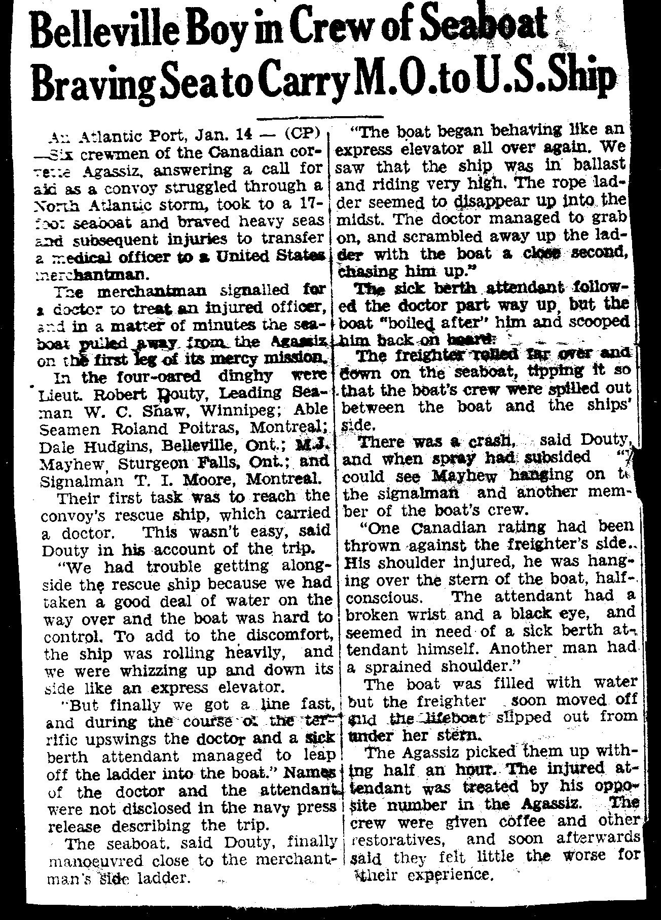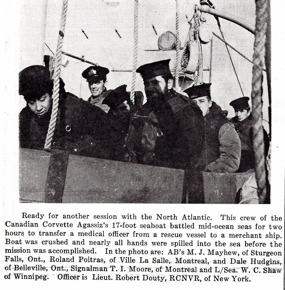 (AGZ011) HMCS AGASSIZ'S seaboat crew transferred a medical officer in rough seas  -  AB M.J. Mayhew, AB Roland Poitras, AB Dale Hudgins, Sig T.I. Moore, LS W.C. Shaw and Lt Robert Douty  //  Crow's Nest newspaper Feb 1944