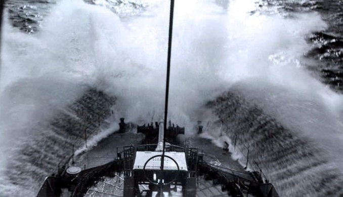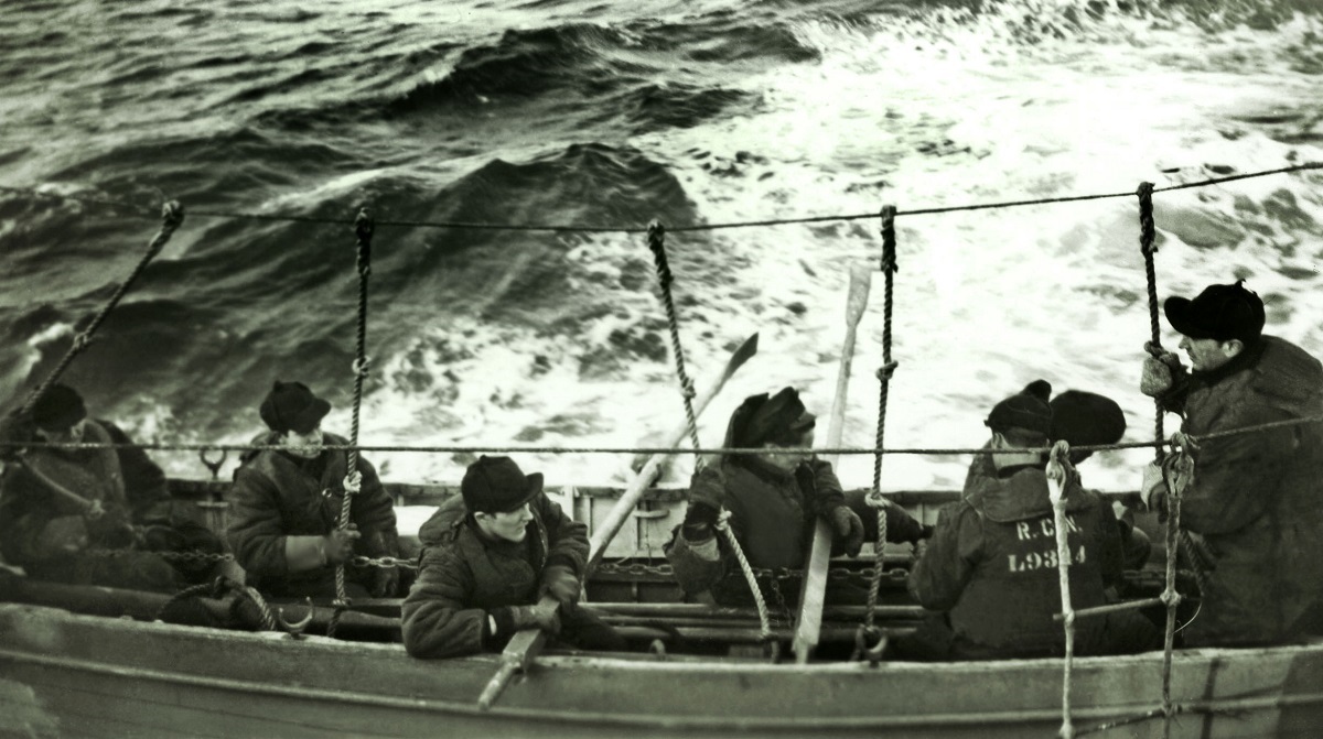 (TM04) Sea boat crew rowing back towards HMCS AGASSIZ K129