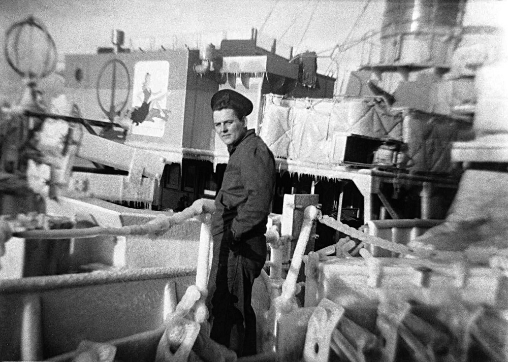 (TM06) Tel Frank (Mac) McAleese on HMCS AGASSIZ - note the ice covering all over the ship. HMCS WETASKIWIN tied up alongside HMCS AGASSIZ