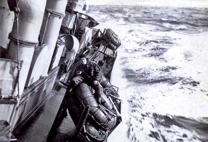 (TM12) Sig Thomas (Tim) Moore perched on the Carley floats at sea