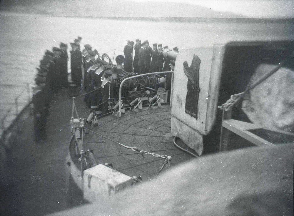 (TM17) Crew of HMCS AGASSIZ on the jetty - unknown person in civilians