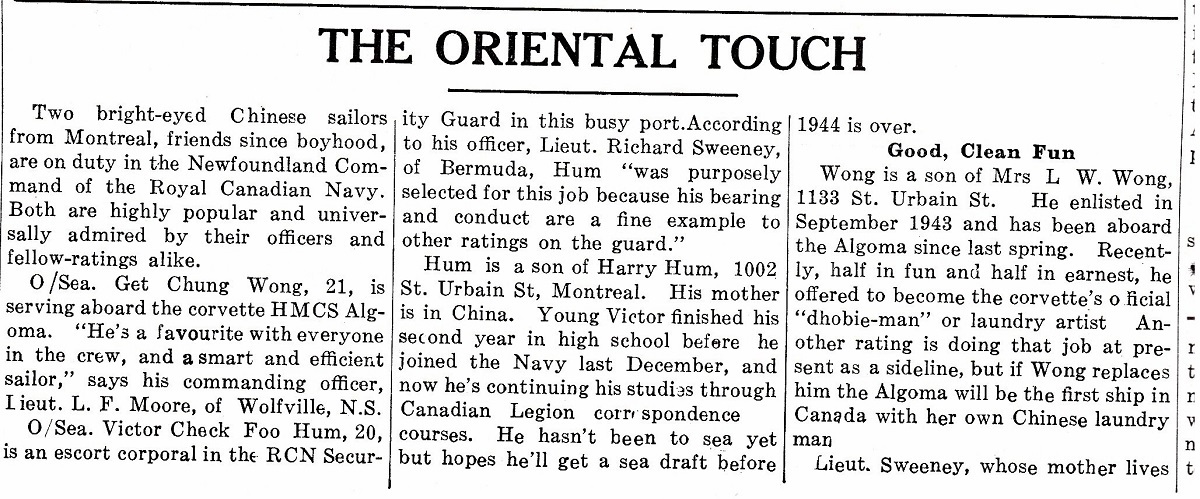 (AGM004) The Oriental Touch  //  Newspaper article on two Chinese sailors from Montreal who served in the RCN  //  OS Get Chung Wong (HMCS ALGOMA) and OS Victor Check Foo Hum