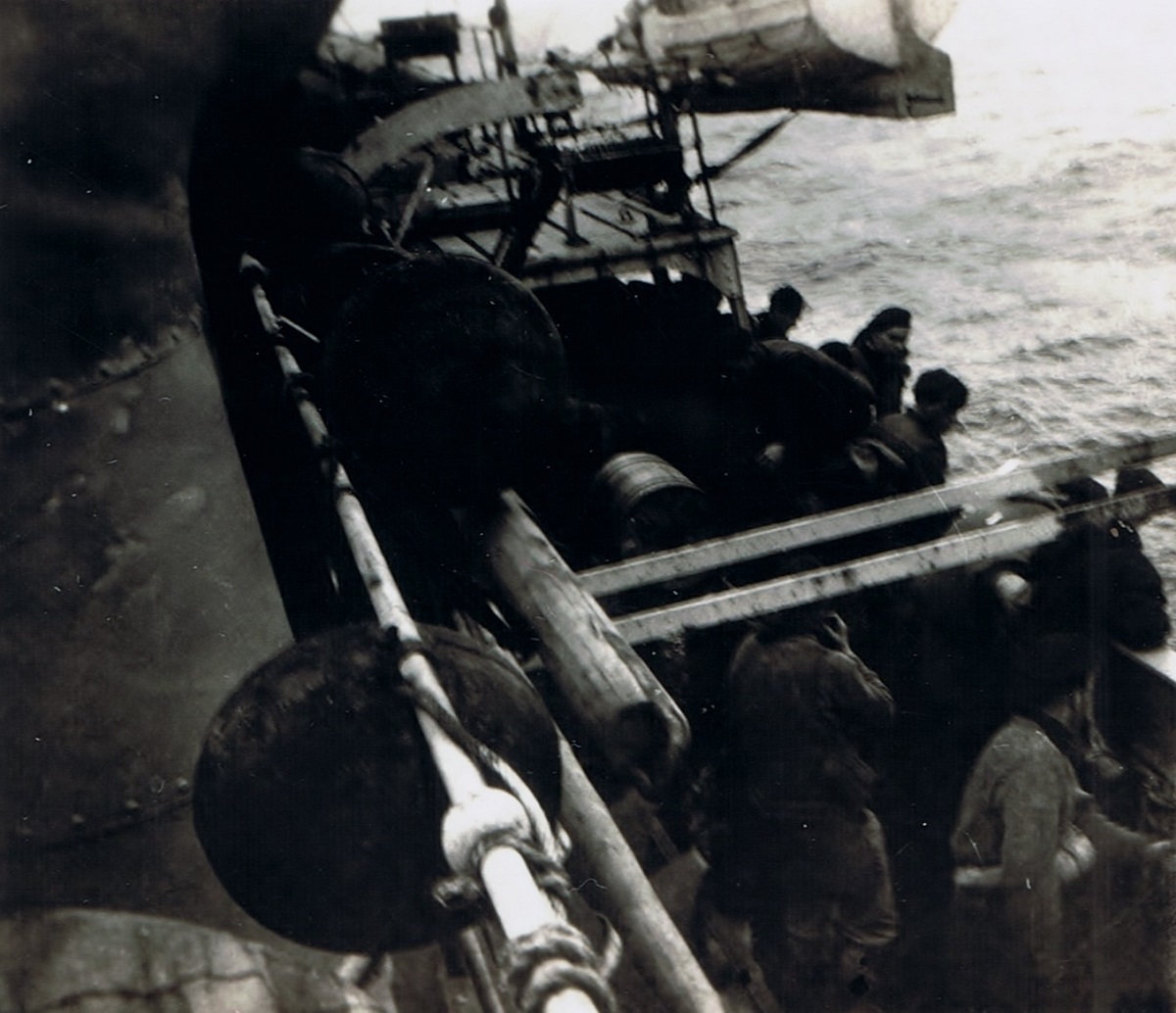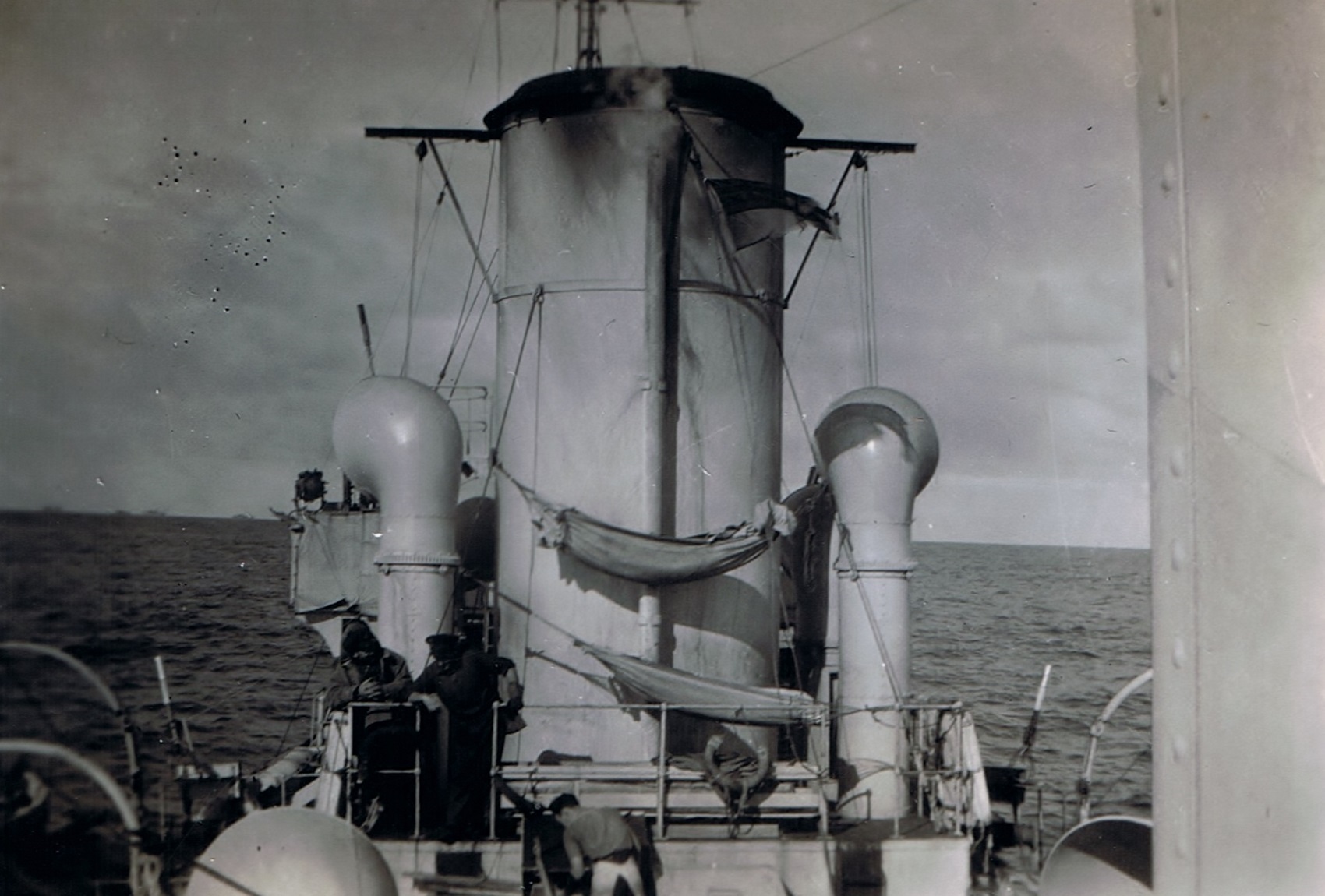 (RC10) Unknown Canadian Corvettes photographed from HMCS AMHERST K148 (RC11) North Atlantic convoy after a storm (RC12) Unknown Canadian destroyer (RC13) A calm North Atlantic - a few ships can be see in the distance (RC14)Modified sleeping arrangements on HMCS AMHERST K148 - hammocks slung by the funnel // Note the convoy in the distance to the left in the photo