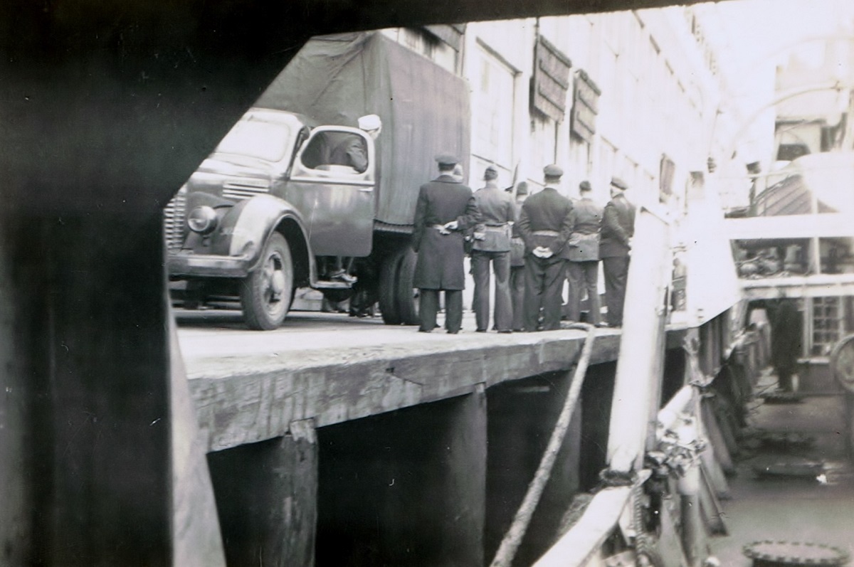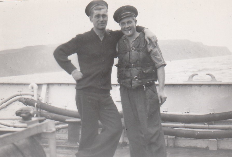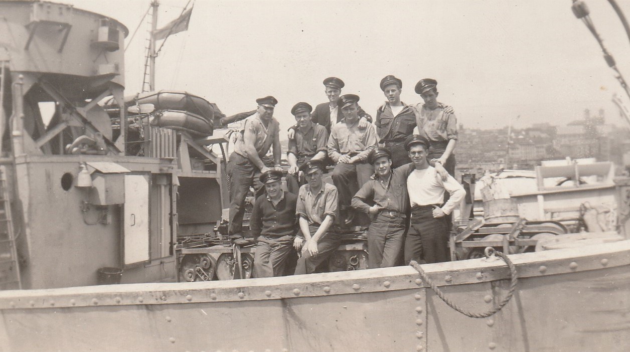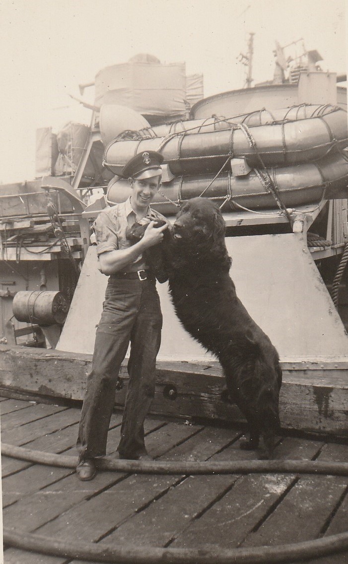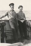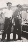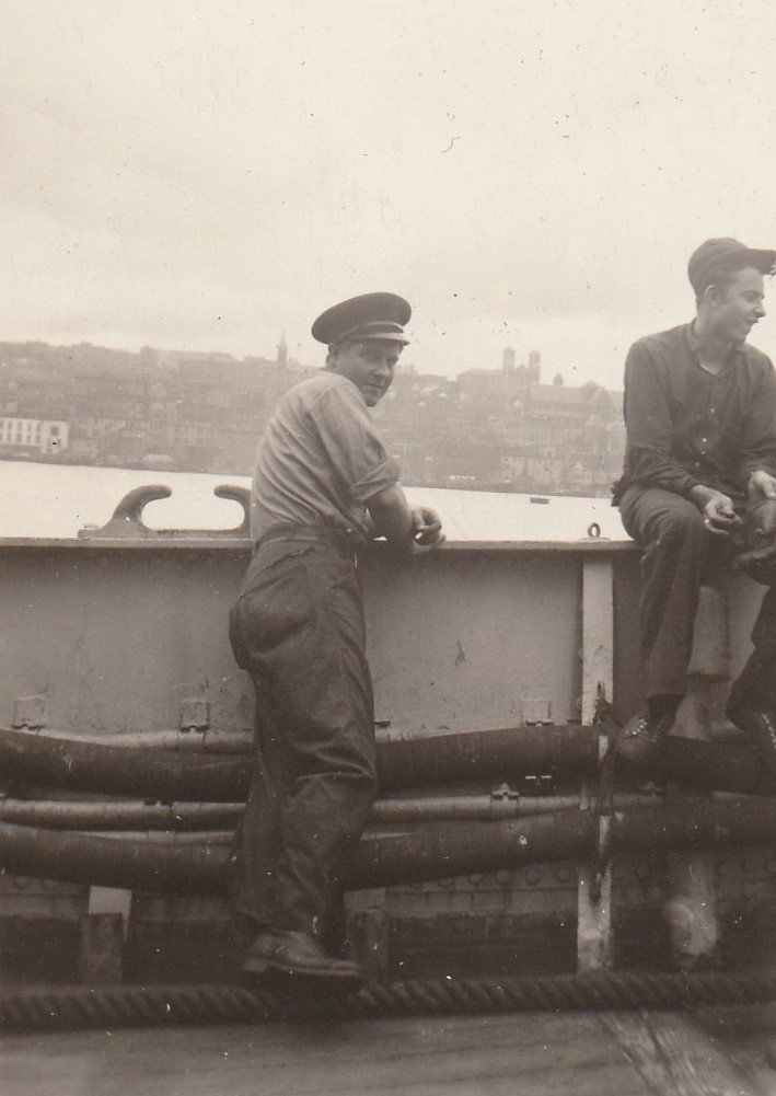 (OC08) Unknown Petty Officer on the jetty with rather large dog with HMCS AMHERST K148 in the background (OC09) Two unknown CPOs on HMCS AMHERST K148 at St. John's, Nfld (OC10) Unknown seaman nd Petty Officer on HMCS AMHERST K148 at sea (OC11) Unknown PO? and unknown seaman on HMCS AMHERST K148 at St. John's, Nfld (OC12) Unknown seaman and Petty Officer on HMCS AMHERST K148. Coast of Newfoundland in the background