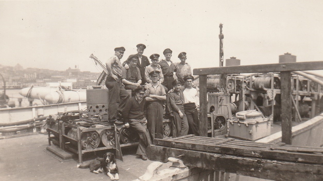 (OC03) Unknown sailors in the after gun tub on HMCS AMHERST K148 (OC04-OC05) HMCS AMHERST'S Chiefs and Petty Officers on the depth charge storage racks just forward of the depth charge rails (OC06) Unidentified allied submarines seen from HMCS AMHERST K148 - location unknown (OC07) Large dog on the jetty with HMCS AMHERST K148 in the background. Ship's mascot??