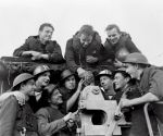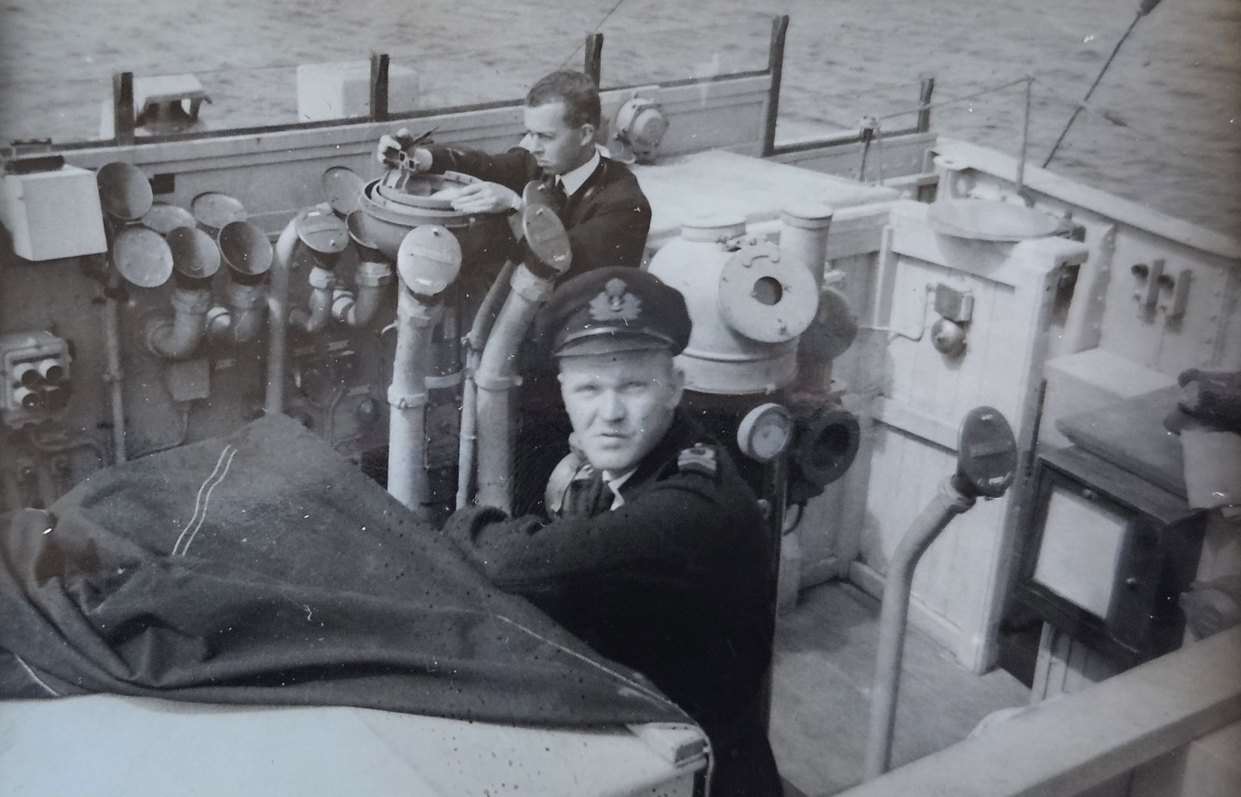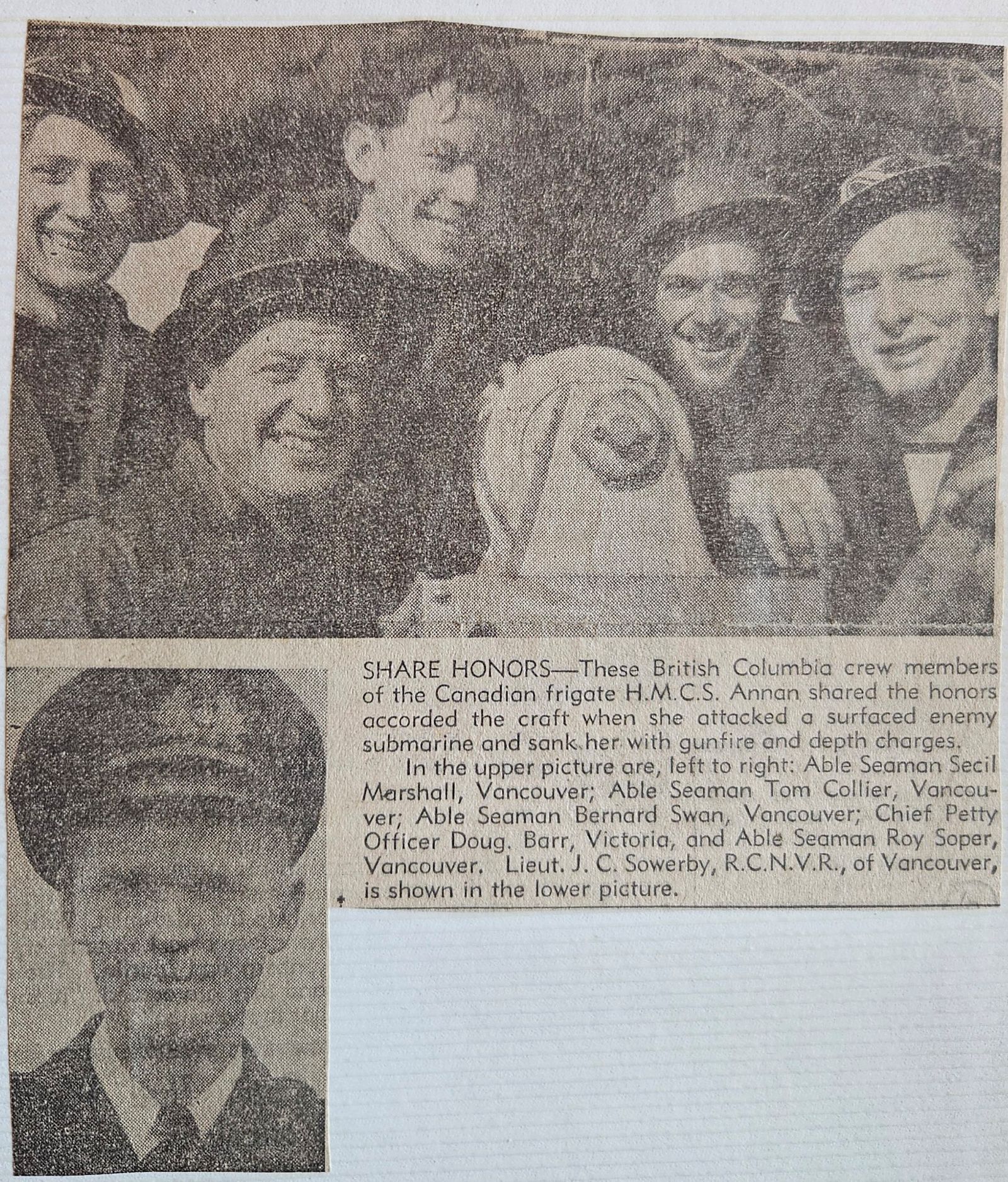 (JCS003) Lt John Sowerby on the bridge of HMCS ANNAN K404 (JCS004) Lt John Sowerby (foreground) and Lt David Howitt on the bridge of HMCS ANNAN (JCS005) British Columbia crew members of HMCS ANNAN share in the honours awarded to HMCS ANNAN after the sinking of U-1006 on 16 Oct 1944 // Listed in the article: AB Secil Marshall of Vancouver; AB Tom Collier of Vancouver; AB Bernard Swan of Vancouver; CPO Doug Barr of Victoria; AB Roy Soper of Vancouver; Lt John Sowerby of Vancouver. From the collection of John Sowerby, LCdr, RCN(R) Courtesy of Pat Lucas