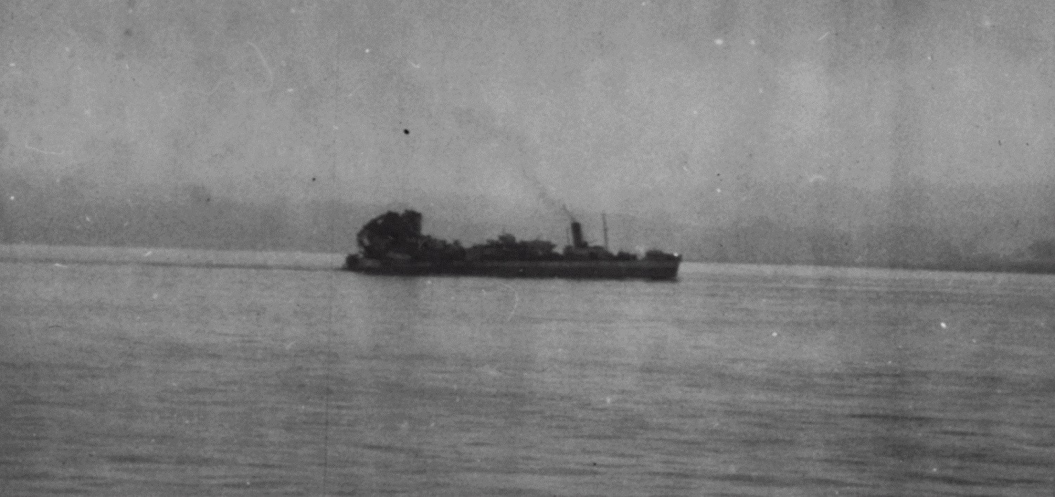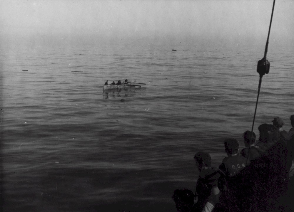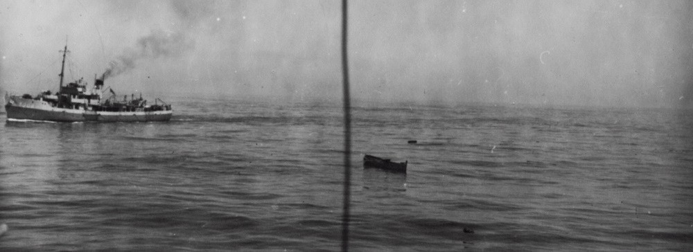 (GGH026) Telegraphist Pringle who lost an eye during the battle between HMCS ANNAN K404 and U-1006 (GGH027) Unknown sub astern of HMCS ANNAN K404 (GGH028) Sunderland flying boat (GGH029) Survivors in motorboat (GGH030) Merchant ship Whitticker, bridge blown back over the ship From the collection of George Hone, RCNVR Courtesy of Randy Hone