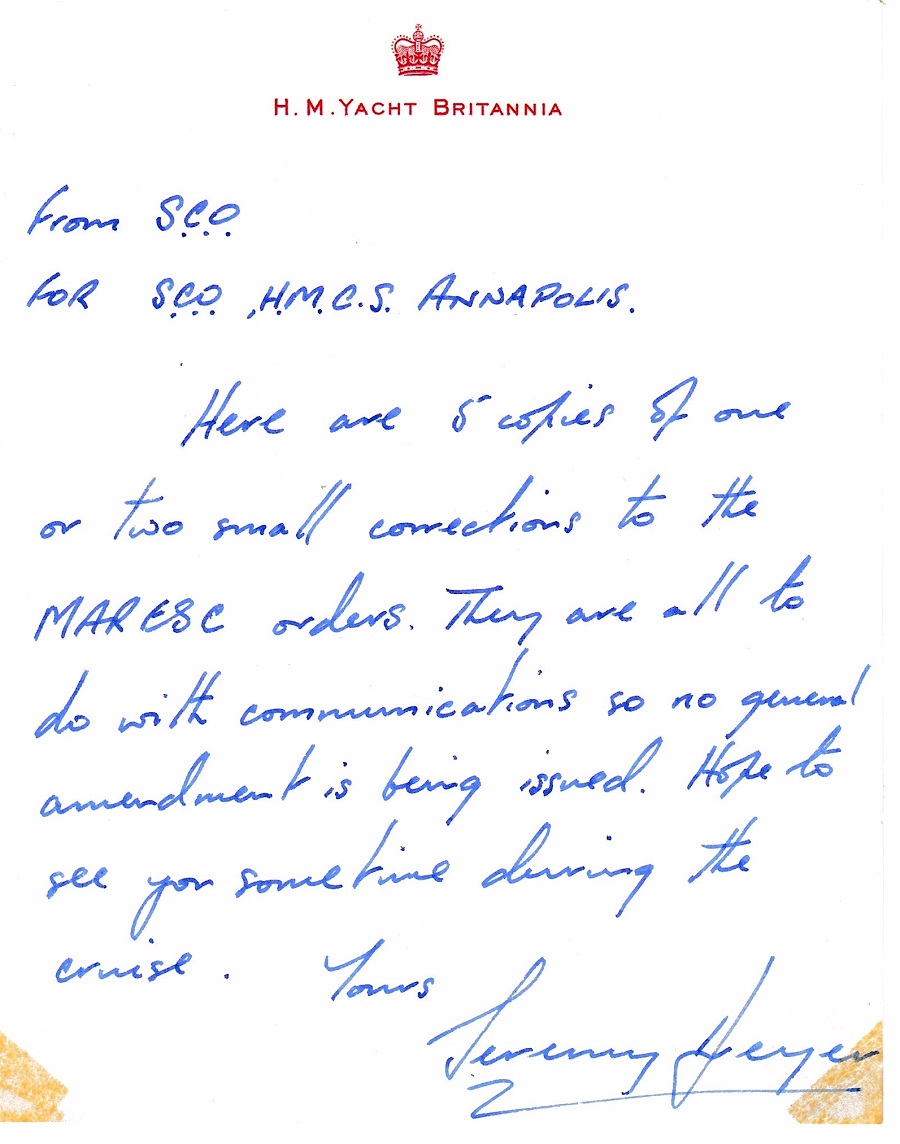 (HG01) HMCS ANNAPOLIS - Escort to the Royal Yacht and the Queen Mother (HG02) Memo accompanying change to the MARESC orders from HMY BRITANNIA (HG03) The Queen Mum on HMCS ANNAPOLIS (HG04) HMCS ANNAPOLIS conducts a sail-past of the BRITANNIA on completion of her escort duties and salutes the Queen Mother