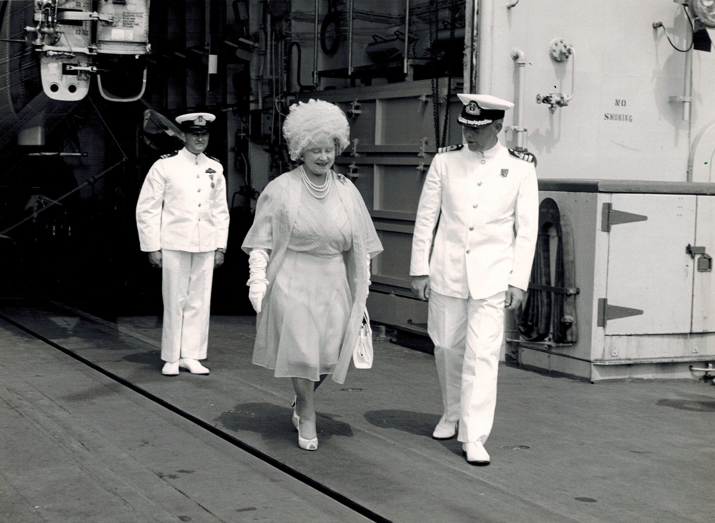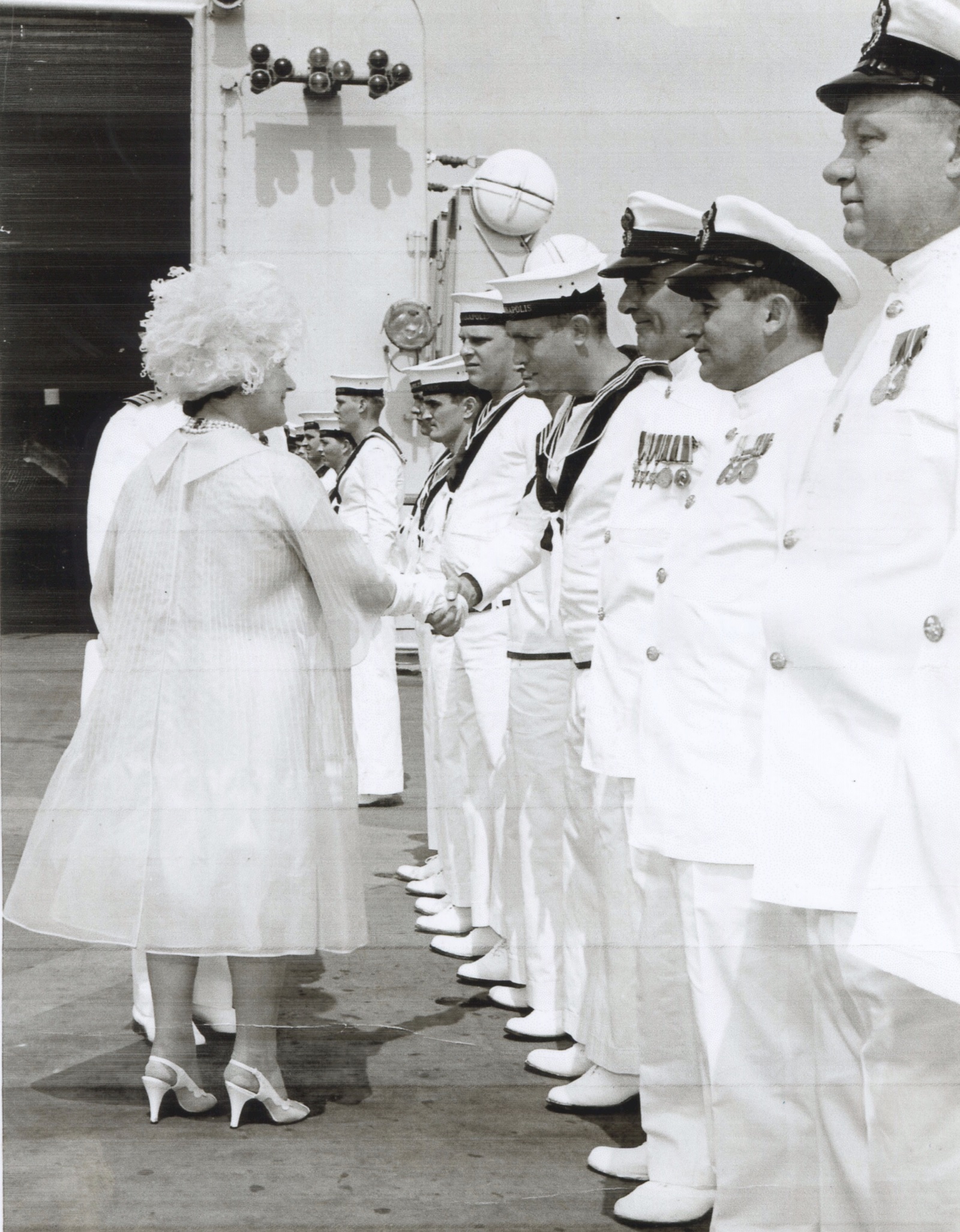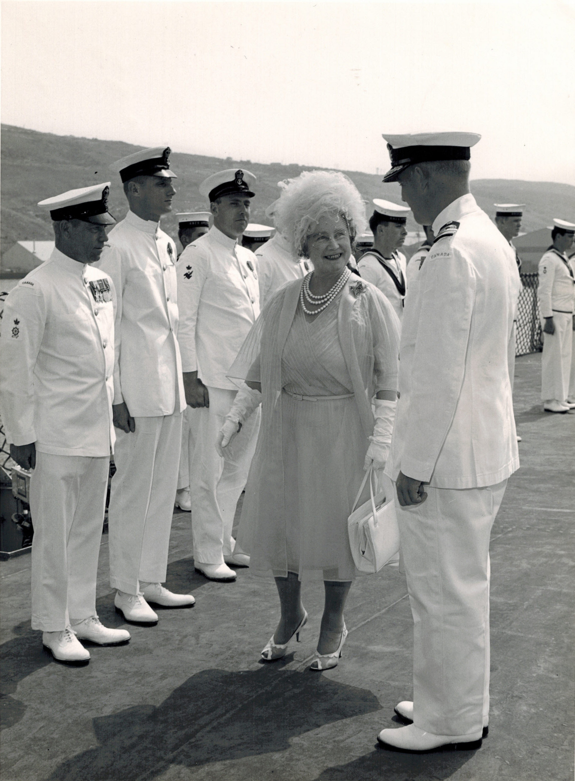 The Queen Mom chats with sailors on HMCS ANNAPOLIS during her visit to the ship - 18 Jul 1967 R-L: CPO Laye, CPO Hall, CPO Armston, PO2 Holland, LS Tanner, Pinkeron, and OS Normand Prevost Courtesy of Bill Edison, P2ET