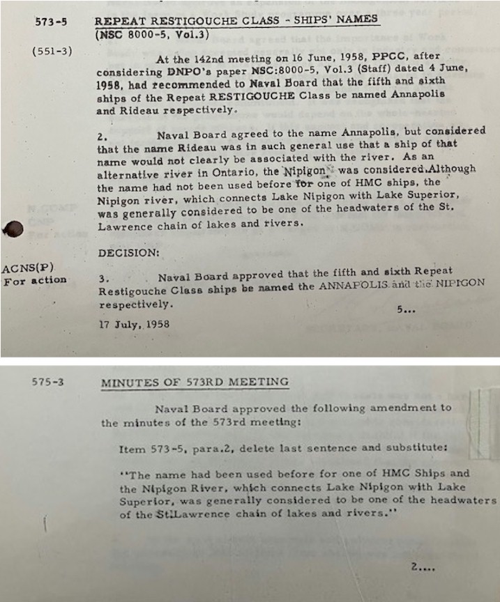 The naming of HMCS ANNAPOLIS and HMCS NIPIGON - Minutes of the 573rd Meeting of the Naval Board, 17 July, 1958, and Minutes of the 575th Meeting of the Naval Board, 10 September, 1958, fond of Peter Haydon at the Naval Museum of Halifax. // Courtesy of Colin Darlington, Naval Museum of Halifax Volunteer