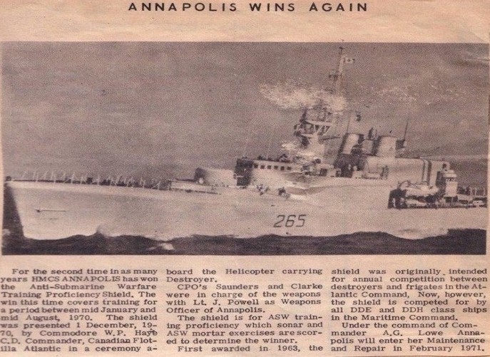 (ANN003) 3"50 mount on HMCS ANNAPOLIS 265 (ANN004) HMCS ANNAPOLIS 265 with the Standing Naval Force Atlantic, Funchal, Madeira, 1977 // Courtesy of Serge Joncas (ANN005) HMCS ANNAPOLIS wins Anti-Submarine Warfare Training Proficiency Shield // Courtesy of Jean Viau (ANN006) HMCS ANNAPOLIS 265, Jan 1969 // Courtesy of Jean Viau (ANN007) The ship's wheel of former HMCS ANNAPOLIS which was for sale at Trinity Marine