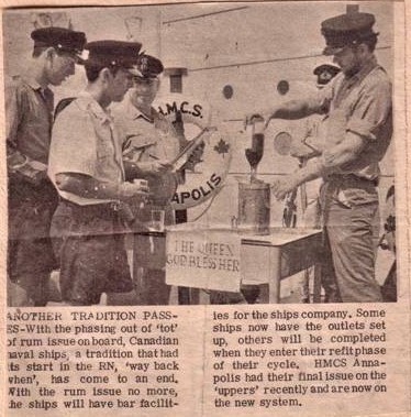 (AF01) Newspaper article on the last tot issued on HMCS ANNAPOLIS (AF02) Garnet Estabrooks preparing to issue the last tot on board HMCS ANNAPOLIS, Mar 1972