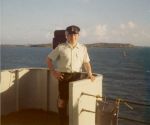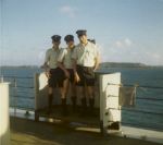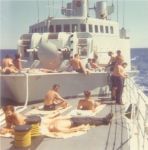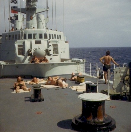 HMCS ANNAPOLIS - Sailing south to the Caribbean - Canada at War Series 1971-1973 Webmaster's note: Canada was not at war at this time ... this is just sailor's humour (AF18) Tanning Stations - Art Fallas relaxing on the foc'sle. Note the can of Olands beer (AF19-AF20) Tanning Stations (AF21) Three sailors modeling the latest Canadian Armed Forces tropical rig (AF22) Art Fallas on the STBD wing Courtesy of Art Fallas