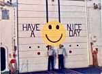 HMCS ANNAPOLIS 1982 - The Happy Ship After about 30 days at sea during an extended exercise the heads of department and crew members were asked for creative ideas to boost morale and relieve boredom. The Air Department came up with using Happy Faces. These photos show the result. Gary recalls learning a valuable lesson in planning ahead ... on the return trip to Halifax he discovered there wasn't any shipside grey paint left to restore the hanger door. So she was showing her happy face to the world for several days back alongside. Artwork by A/B Tom Taylor and M/S Gary Gunnell Gary Gunnell provided these photos and anecdote Courtesy of Dave Borrowman