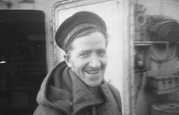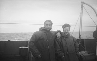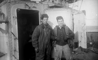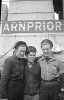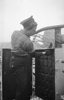 (MB55) L-R: Arthur Stenning, Marshall Burns and Ken Gough on HMCS ARNPRIOR (MB56) Marshall Burns with ship's mascot on HMCS ARNPRIOR (MB57) Marshall Burns (left) and Arthur Stenning on HMCS ARNPRIOR (MB58) L-R: Arthur Stenning, Ken Gough and Marshall Burns on HMCS ARNPRIOR (MB59) Unknown sailor by the ready-use magazine on HMCS ARNPRIOR