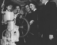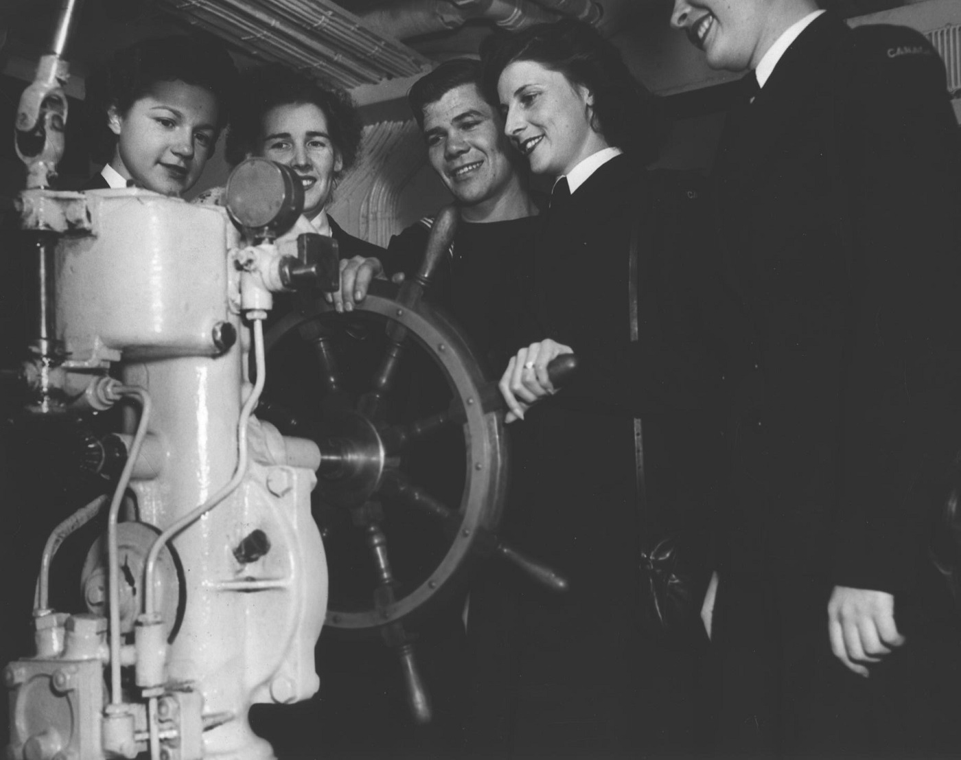 (MB68) Caption on news publication: When Wrens came aboard HMCS ARNPRIOR in Newfoundland for a ship's party, Leading Seaman Marshall Burns of Ottawa thought they'd like to see the wheelhouse of their fine castle class corvette. Interested onlookers are Wren Margaret Wood of MONTREAL, Wren Joan Shannon of MARMORA, Ontario; and Wren Gwen Bill of RED DEER, Alberta. Royal Canadian Photography - Navy Information Section - Negative No 2859
