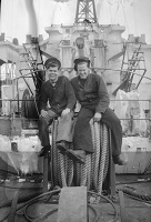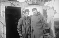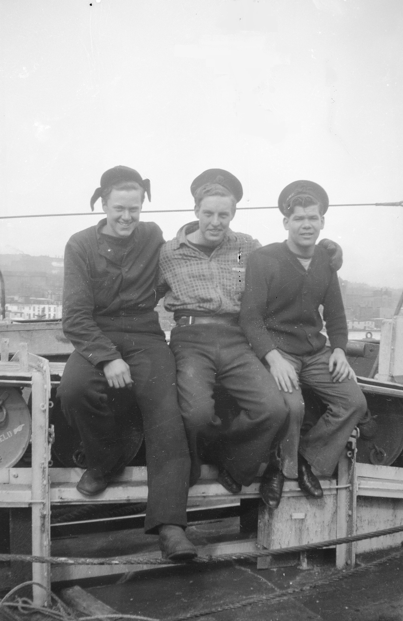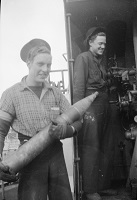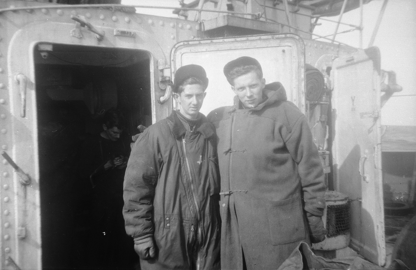 (MB64) Marshall Burns on HMCS ARNPRIOR (MB65) Unknown sailors on HMCS ARNPRIOR (MB66) Marshall Burns (right) with unknown sailor on HMCS ARNPRIOR (MB67) Ken Gough passing a shell to Arthur Stenning at forward gun on HMCS ARNPRIOR. (note: based on their dress and the casual look of things they likely are doing gun drills alongside)