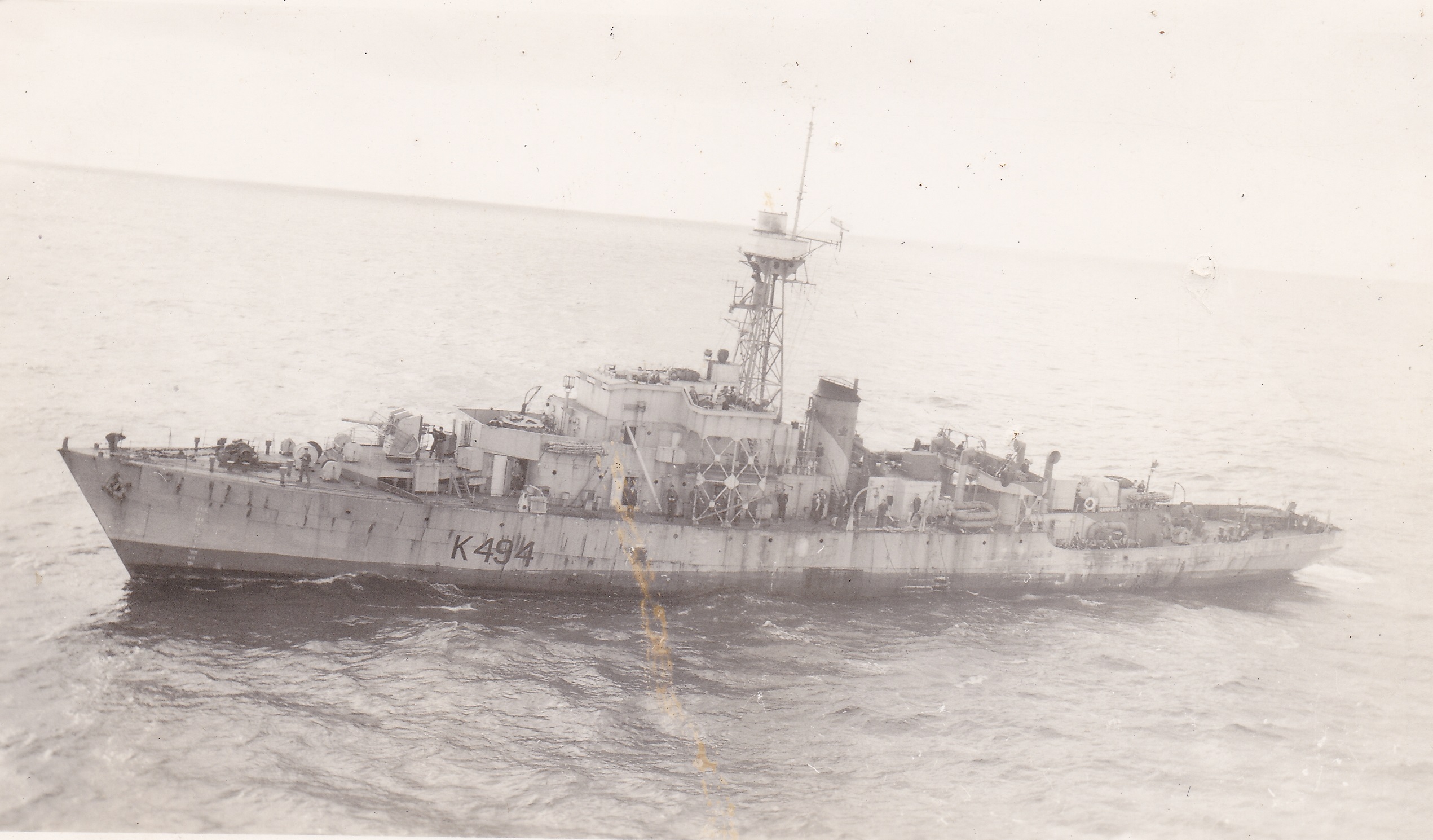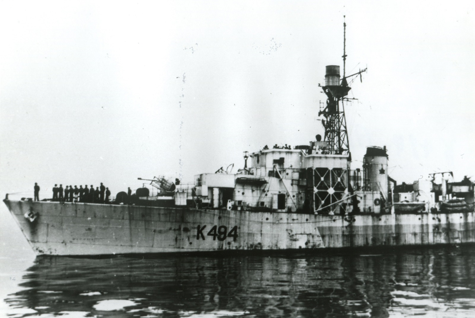 Laid down as HMS Rising Castle K398, she was built by Harland & Wolff Ltd., Belfast, Ireland. After completion, in the midst of a dockyard strike, she was transferred and commissioned into the RCN on 08 Jun 1944 as HMCS ARNPRIOR K494 (renamed on the day she was commissioned). After working up at Tobermory she joined EG C-1 at Londonderry in August, leaving on 19 Aug 1944 to join her first convoy, ONM.249. ARNPRIOR was continuously employed as an ocean escort for the balance of the war. At the beginning of Jun 1945, she left Greenock for St. John's, where she underwent a two-month refit, and from September was based at Halifax. She was paid off there on 14 Mar 1946, and sold later that year to the Uruguayan Navy, which renamed her Montevideo and operated her as a training ship until 1975. (Mcpherson / Burgess - Ship's of Canada's Naval Forces 1910-1981)