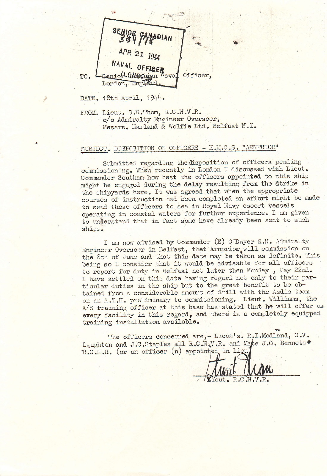 (ARN001) Letter from Lt. S. D. Thom, CO, HMCS ARNPRIOR to the Senior Canadian Naval Officer London re the disposition of officers appointed to HMCS ARNPRIOR while she is under construction - dated 18 Apr 1944 // Officers mentioned in the letter: Lt R.I. Medland, C.V. Laughton and J.C. Staples, all RCNVR and Mate J.C. Bennett, RCNR // Source: Library and Archives of Canada // Courtesy of Gary King (ARN002) HMCS ARNPRIOR K494 (centre) and HMCS Hallowell K666 (right). Ship on left unknown // From the Photo collection of Hugh A. Benson // Courtesy of Doug Benson (ARN003) HMCS ARNPRIOR K494 // From the collection of Tom Coyle, Sto 1c, RCNVR // Courtesy of Elaine Desnoyers (ARN004) HMCS ARNPRIOR K494 // From the collection of John Boothman // Courtesy of Dave Boothman (ARN005) HMCS ARNPRIOR alongside in St John's, Nfld with the surrendered U-190 across the jetty from her. ML Q095 in the background // Courtesy of Bill Perks