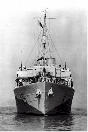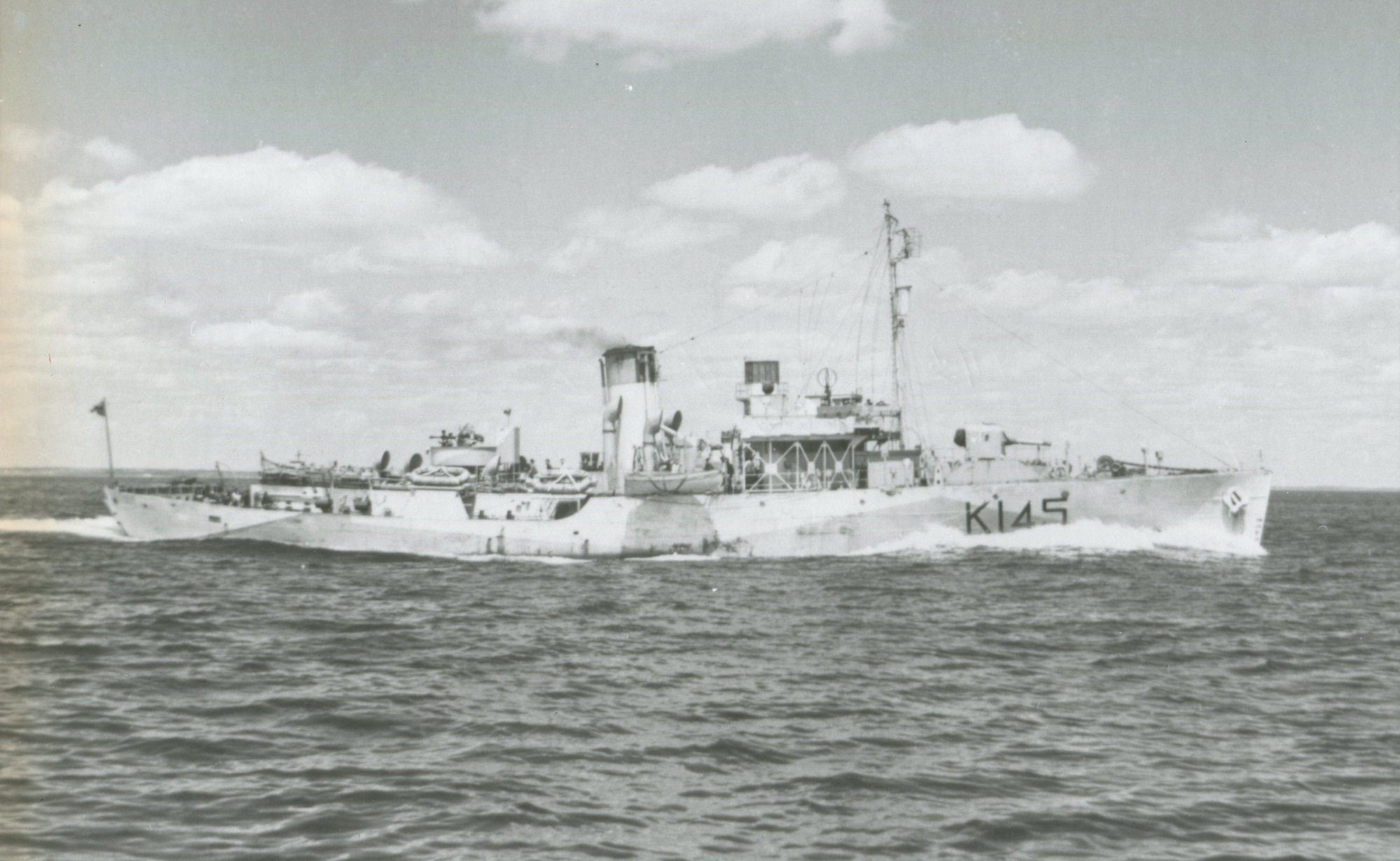 Built for the RN, she was commissioned at Sorel on 22 Nov 1940 as HMS ARROWHEAD K145. After arriving at Halifax on 03 Dec 1940 she carried out workups and sailed on 21 Jan 1941, with convoy HX.104 for Sunderland. There she was in dockyard hands for the two months' work required to complete her fully. After working up at Tobermory ARROWHEAD joined EG 4, Iceland Command (RN). On 15 May 1941, she was transferred to the RCN and commissioned as HMCS ARROWHEAD K145. In Jun 1941 she transferred to the newly formed NEF. For the rest of 1941 she escorted convoys between St. John's and Iceland, proceeding early in Dec 1941 to Charleston, S.C. for refit. Returning to Halifax in Feb 1942, she made one round trip to Londonderry before joining WLEF. In Jul 1942 she transferred to Gulf Escort Force, escorting Quebec/Gaspé-Sydney convoys, and in Oct 1942 joined Halifax Force and for two months escorted Quebec-Labrador convoys. On 30 Nov 1942 she rejoined WLEF at Halifax, to remain with it until Aug 1944. When this escort force was divided into escort groups in Jun 1943, ARROWHEAD became a member of EG W-7, transferring to W-1 in Dec 1943. During this period she underwent two major refits: at Charleston, S.C., in the spring of 1943, and at Baltimore, Md., a year later. During the latter refit her fo'c's'le was extended. In Sep 1944, she joined Quebec Force and was again employed escorting Quebec-Labrador convoys. In De 1944 she transferred to EG W-8, WEF, and served on the "triangle run" (Halifax, St. John's, New York/Boston) for the balance of the war. On 27 May 1945, ARROWHEAD left St. John's to join convoy HX.358 for passage to Britain, where she was paid off and returned to the RN on 27 Jun 1945, at Milford Haven. Sold in 1947 for conversion to a whale-catcher and renamed Southern Larkspur, she was finally broken up at Odense, Denmark, in 1959.