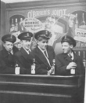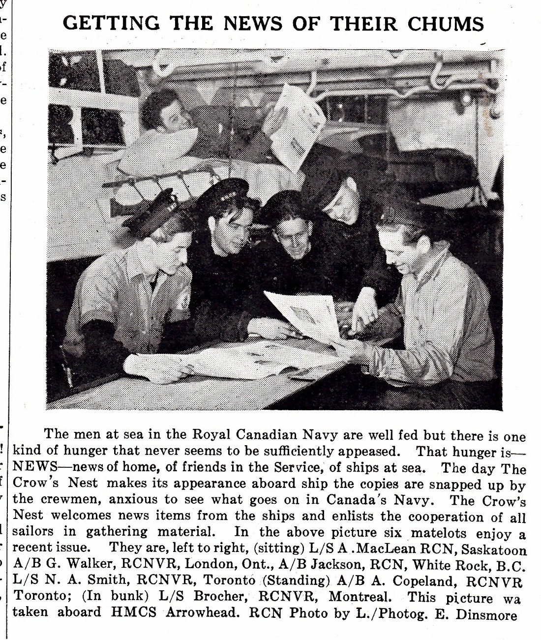 (ARH001) Ensign from HMCS ARROWHEAD K145 - This battered White Ensign from the corvette HMCS ARROWHEAD testifies to the North Atlantic's atrocious weather. Although this flag appears to have been through a battle, the damage is the result of wind and water, which have torn seams and frayed fabric. Before the switch to flags printed on nylon fabric, flags were made of strips of coloured cloth sewn together in the necessary patterns. This flag, damaged during a storm, was kept by Arthur Statham, who served aboard ARROWHEAD. From 1910 until 1965, Royal Canadian Navy ships flew the same white ensign as Britain's Royal Navy. // White Naval Ensign CWM 19680136-001. Source: Canadian War Museum (ARH002) Sailors on HMCS ARROWHEAD reading the Crow's Nest newspaper - LS A. MacLean of Saskatoon; AB G. Walker of London, ON; AB Jackson of White Rock, BC; LS N.A. Smith or Toronto, ON; AB A. Copeland of Toronto, ON; and, LS Brocher of Montreal // Crow's Nest Magazine - May 1944 (ARH003) HMCS ARROWHEAD K145 - Click here to view a larger version of this photo - though of slightly lesser quality (ARH004) HMCS ARROWHEAD K145 - RCN photo (ARH005) Four crew of HMCS ARROWHEAD at a bar in New York, Jan 1945. HMCS ARROWHEAD arrived in New York, escorting a convoy of empty ships returning from England. (L-R) Len Taylor, Ellwod Reynolds, Glenn Martin, Ted (Trevor) Hill // Courtesy of Barb Ishler and Douglas Harman