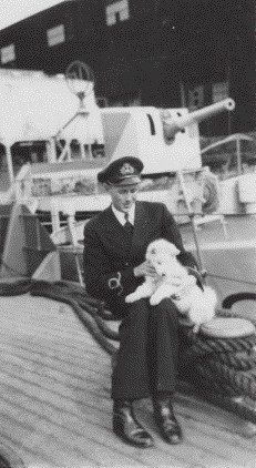 (JW01) HMCS ARROWHEAD K145 (JW02) HMCS ARROWHEAD K145 (JW03) Hamilton, mascot of HMCS ARROWHEAD K145 with John Wampler (JW04-JW05) Hamilton, mascot of HMCS ARROWHEAD K145 From the collection of John Wampler, SLt, RCNVR Courtesy of Barb Ishler