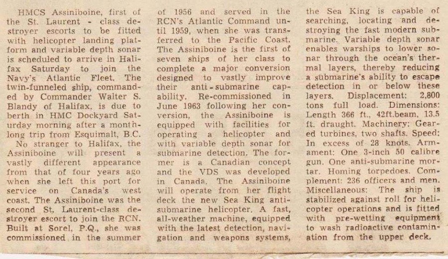 Newspaper article on HMCS ASSINIBOINE from The Halifax Mail Star, 24 Oct 1963
