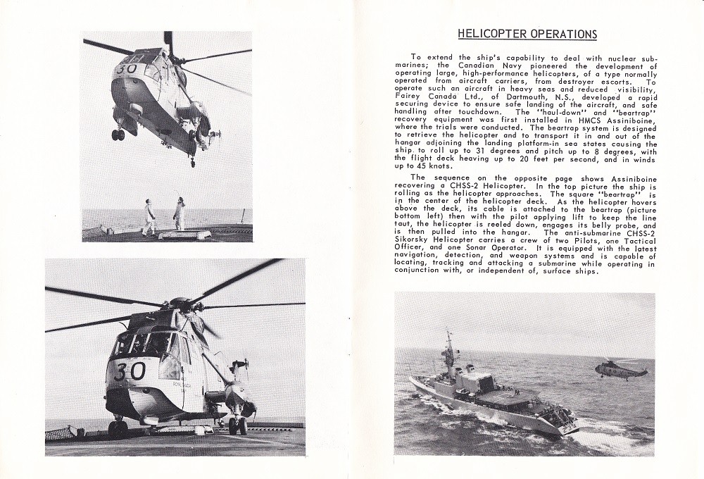 In Jun 1962 she began her conversion to a helicopter carrying destroyer (DDH), the first of her class to under the procedure, which was largely carried out by the Victoria Machinery Depot. Re-commissioned on 28 Jun 1963, she returned to Halifax. In Jan 1975, ASSINIBOINE took off the crew of the freighter Barma, which was shipping water 185 miles off Boston.