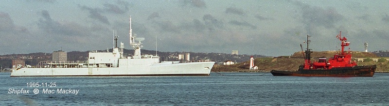 Former HMCS ASSINIBOINE leaving Halifax November 25, 1995 under tow by the Russian tug Kaliningradets. ASSINIBOINE and Kaliningradets were reported in Durban February 7, 1986 en route to India and the breaker's yard.
