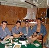 (L-R) Radioman Charlie Nichol, unknown, Signalman Bob Ward, Radioman Hal Benson relaxing in the mess deck after coming off watch