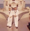 This picture shows the Governor General Roland Mitchener and his wife with the helicopter fire fighting crew, which at the time was a secondary duty of members of the ships company, as the ship didn't carry any dedicated firefighters. I'm  (Robert Thomas) standing to the right of Mrs. Mitchener and was the only person who had an all silver fire fighting suit . As I recall, she asked me if I was "special". The Sikorsky H04S-3 (Pedro) we carried for the trip is now part of the National Aviation and Space Museum collection and on display in Ottawa. The rescue diver in the picture is LS Olan who was lost overboard during a storm in 1969.. The picture was taken by a Killick Photographer assigned to cover the cruise and it cost me a tot. He developed it in a portable photo lab set up in sickbay.