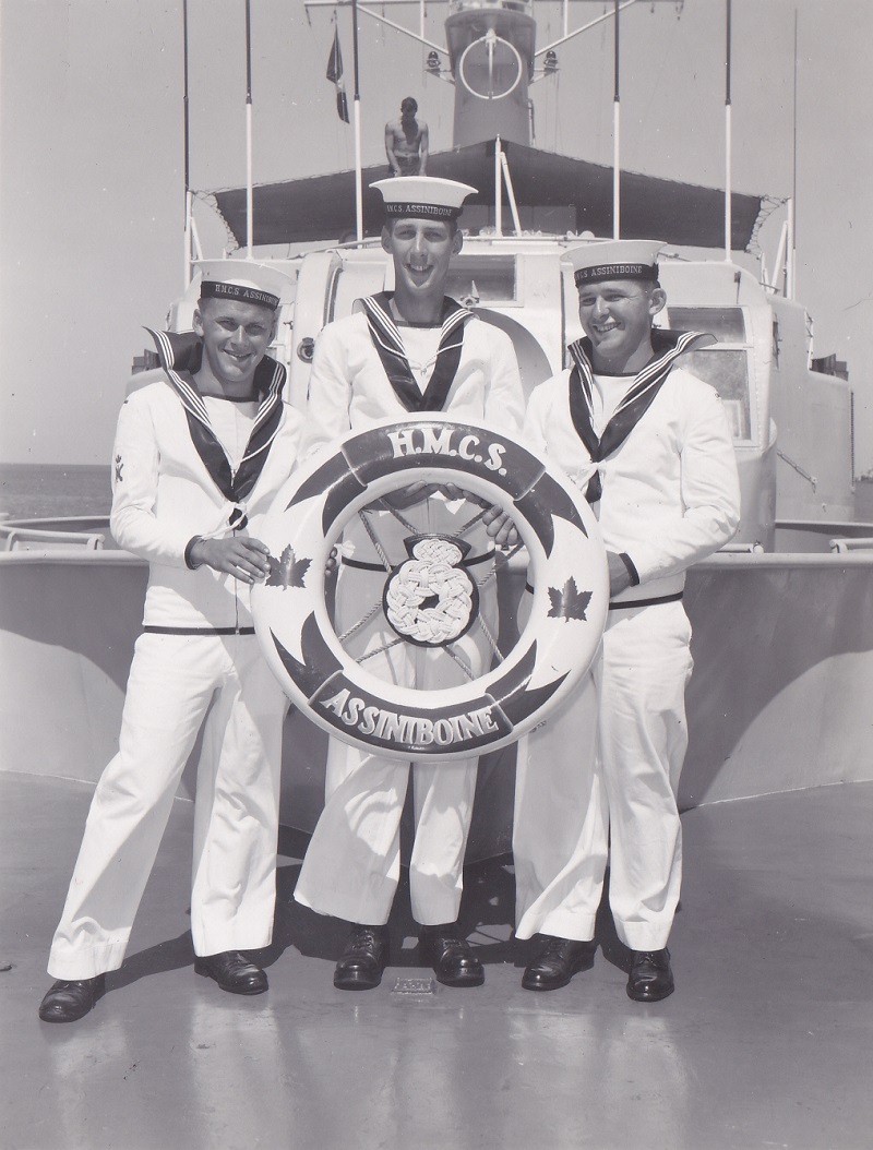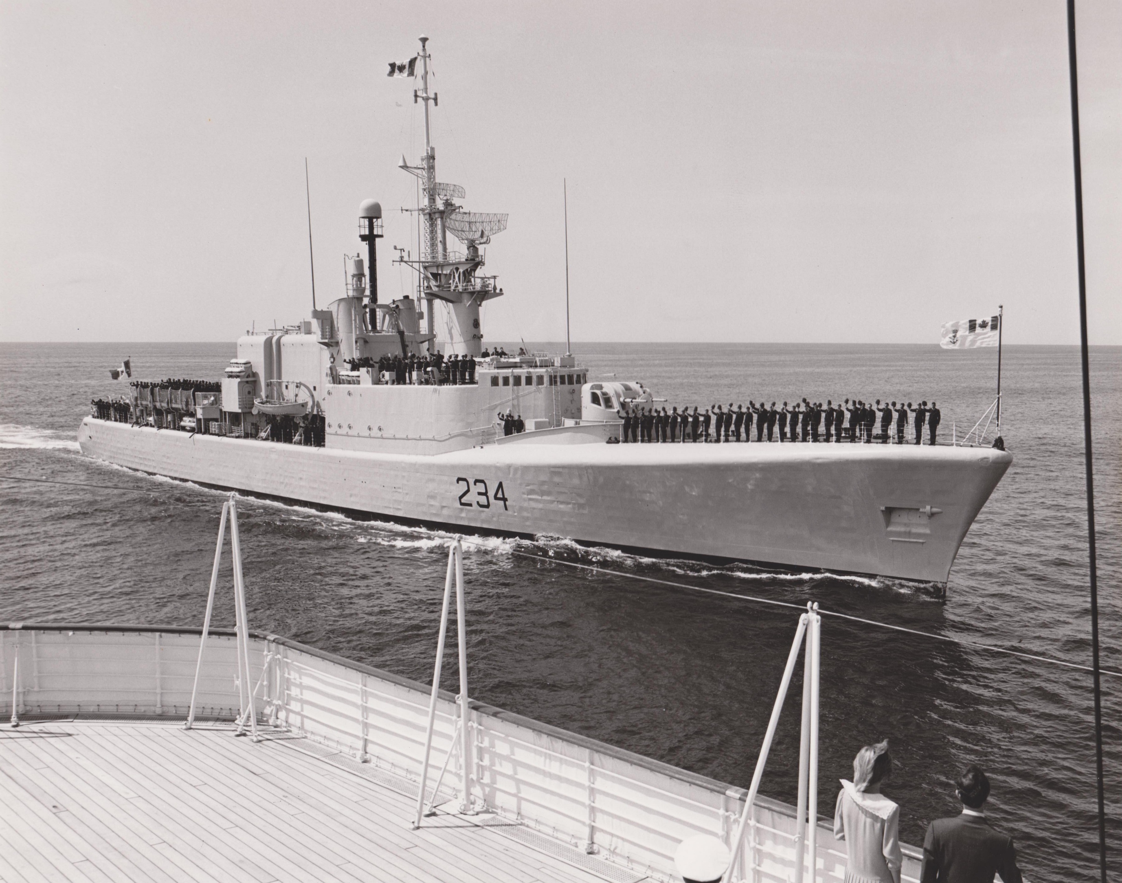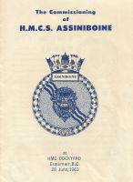 ASSINIBOINE was the first ship delivered postwar to the RCN by Marine Industries Ltd., Sorel and was commissioned there on 16 Aug 1956. In January 1959, after two years' service on the east coast, she was transferred west, and in Jul 1959, had the honour of carrying Queen Elizabeth and Prince Philip from Vancouver to Nanaimo.