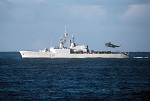 Shortly after 9:00 a.m. a Portuguese frigate, the Almirante Gago Coutinho, approached ASSINIBOINE. She was clearly at action stations and circled around us. Our reaction was to go to a higher degree of watertight integrity but to take no overt action which might be perceived as threatening or provocative by the Portuguese. At the same time, we were giving serious thought as to what to do if she attempted any hostile action. What we did not know was that the Army was equally uncertain about the frigate's intentions and had tanks ready to fire at it if it took hostile action. However, in mid-morning, after its officers had apparently refused the orders of the Captain to fire on the city, the ship elevated its guns skyward and withdrew.{3}