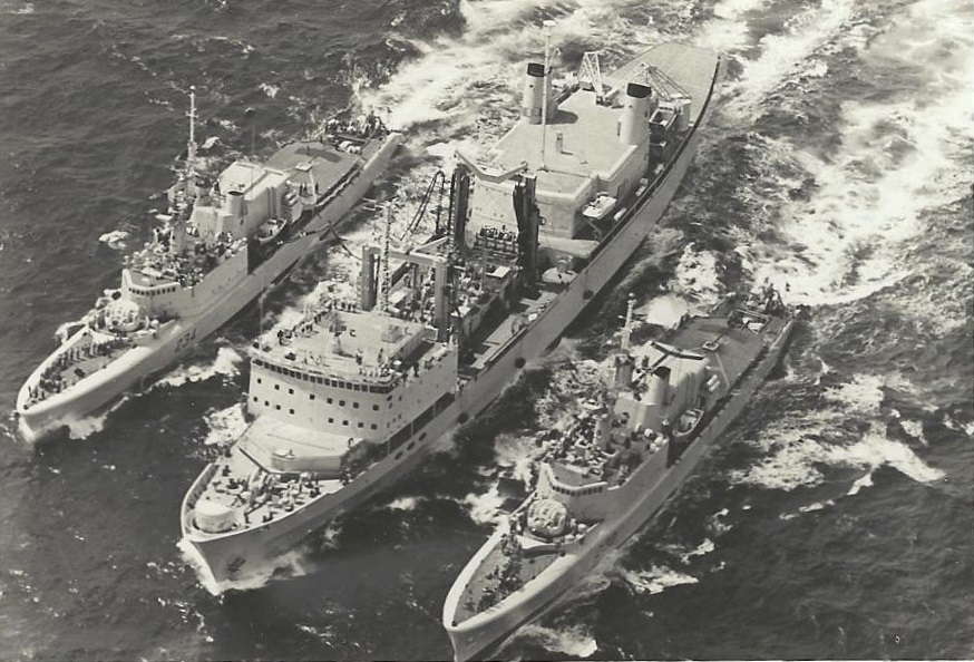 HMCS PRESERVER 510 conducting a RAS with HMCS ASSINBOINE 234 (Stbd side) and unknown DDH on port side - 22 Feb 1971 during Ex Maple Spring '71