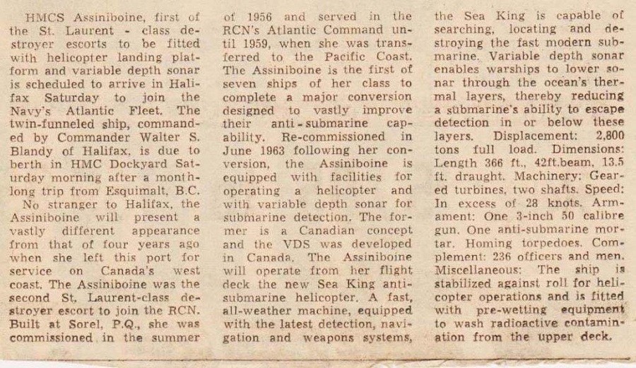 (ABN006) Helo Haul Down System on HMCS ASSINIBOINE 234 // From the collection of LCdr Larry Zbitnew // Courtesy of Dennis Cardy (ABN007) HMCS ASSINIBOINE 234 // On 27 November 1963, the new landing platform aboard HMCS ASSINIBOINE was used for the first operational destroyer landing of a production CHSS-2. // DND- RCN photo (ABN008) HMCS ASSINIBOINE 234 // On 27 November 1963, the new landing platform aboard HMCS ASSINIBOINE was used for the first operational destroyer landing of a production CHSS-2. // Photographer: Raymond Cumby // Courtesy of Raymond Cumby (ABN009) Newspaper article on HMCS ASSINIBOINE from The Halifax Mail Star, 24 Oct 1963 // Courtesy of Art Moore (ABN010) Splice the Mainbrace on board HMCS ASSINIBOINE // Governor General's Cruise, 1968 // Courtesy of Tom Wright