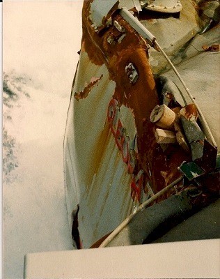 (ABN016 - ABN017) Damage to HMS Cleopatra after being hit by HMCS ASSINIBOINE circa 1980 // Courtesy of Warwick Franklin // HMS CLEOPATRA (ABN018) HMCS ASSINIBOINE 234 // USN Photo - 1986 // Public domain