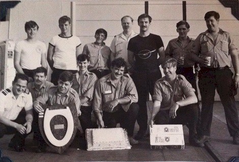 (SMA001) Crossing the Line certificate for the Equator - Steven Mark Adams - 27 Feb 77 // South American Cruise - HMCS ASSINIBOINE, HMCS Algonquin, HMCS Protecteur (SMA002) HMCS ASSINIBOINE 234 "Flight Deck Olympics" September 1976 // "11 mess wins again" // "I am back row 2nd from the right (Steven Adams). I know that there is Lt. Gosse, Gerry Quesnel, Kenny Moen, Bob Carlsen, Robin Hill, Gerry Springer, Knobby Clarke but the rest are faces without names now." Courtesy of Steven Mark Adams