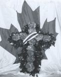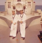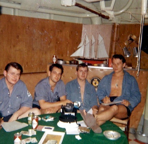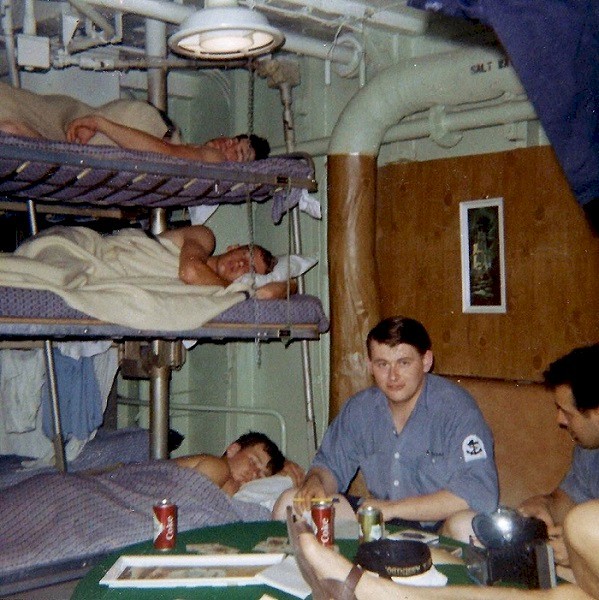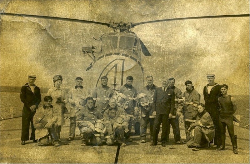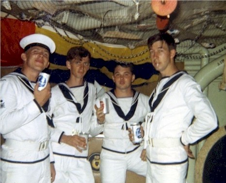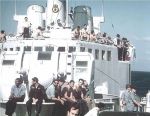 (RJT001) HMCS ASSINIBOINE 1968 Governor General's Centennial Cruise of Newfoundland. // This picture shows the Governor General Roland Mitchener and his wife with the helicopter fire fighting crew, which at the time was a secondary duty of members of the ships company, as the ship didn't carry any dedicated firefighters. I'm (Robert Thomas) standing to the right of Mrs. Mitchener and was the only person who had an all silver fire fighting suit . As I recall, she asked me if I was "special". The Sikorsky H04S-3 (Pedro) we carried for the trip is now part of the National Aviation and Space Museum collection and on display in Ottawa. The rescue diver in the picture is LS Olan who was lost overboard during a storm in 1969.. The picture was taken by a Killick Photographer assigned to cover the cruise and it cost me a tot. He developed it in a portable photo lab set up in sickbay. (RJT002) HMCS ASSINIBOINE, Maple Spring 1969 // Wayne Robbins with sparkers Ted Brown, Jake Thomas and Pete Melnyk, enjoying a coolie after a guard practice at Martinique in the Lesser Antilles. (RJT003) HMCS ASSINIBOINE off Norfolk Va, late 1960's. 'Goofers' watch a rehearsal for the Naval Air portion of a NATO fire power demonstration, while the ship acts as plane guard for the USS John F. Kennedy. Always remember that trip. The concussions from nearby 500lb bomb blasts forced some of the one-way flapper valves, that kept sea water from coming up the the waste water pipes, stuck open. On the trip back to slackers, using the forward heads was like playing Russian Roulette. (RJT004) Signalmen on HMCS ASSINIBOINE in their racks in the mess deck. Charlie Nichol sitting on the left side of the settee // Webmaster's note: This was how we lived on the ships. Quarters were close and you learned to ignore everything so you could get some sleep. (RJT005) (L-R) Radioman Charlie Nichol, unknown, Signalman Bob Ward, Radioman Hal Benson relaxing in the mess deck after coming off watch (RJT006) Memorial Service held on HMCS ASSINIBOINE 234 on 26 Oct 1969 for the crew of HMCS Kootenay 258 and those killed and injured during the explosion on her on 23 Oct 1969. Courtesy of Robert Earl (Jake) Thomas