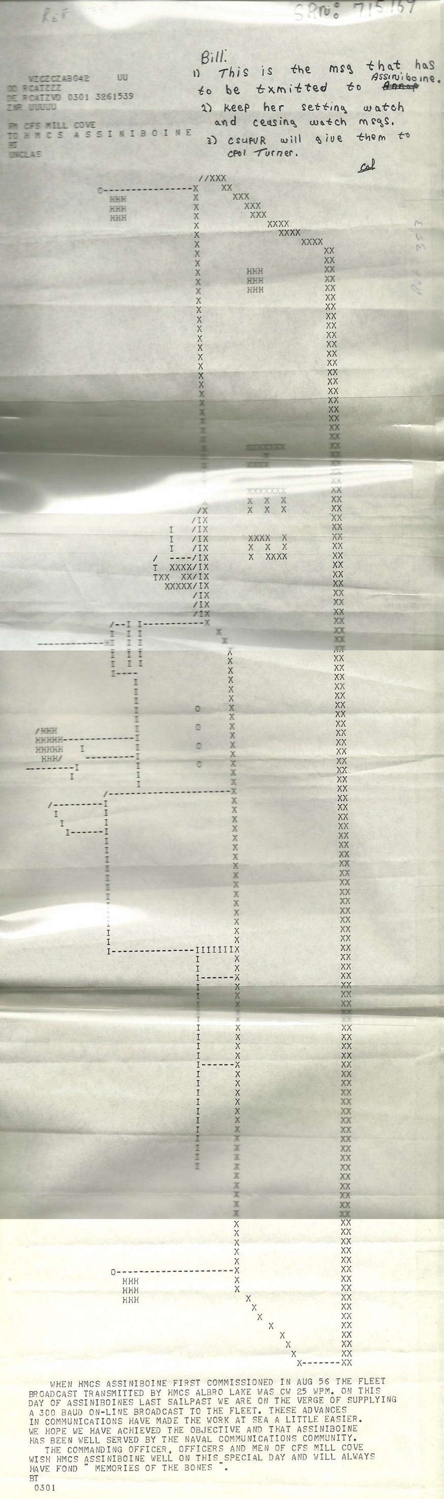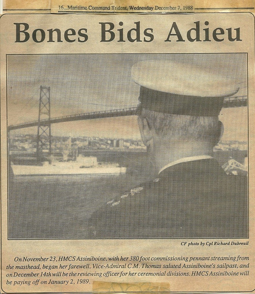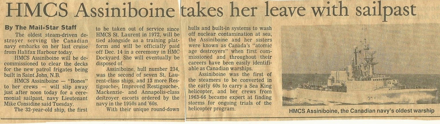 (CM001) Newspaper article on HMCS ASSINIBOINE'S final sail past // Trident Magazine 07 Dec 1988 (CM002) Newspaper article on HMCS ASSINIBOINE'S final sail past (CM003) Final message from CFS Mill Cove to HMCS ASSINIBOINE 234 Courtesy of Claude Morissette