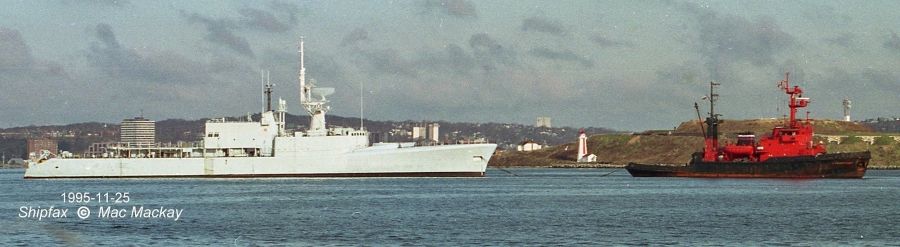 Former HMCS ASSINIBOINE leaving Halifax November 25, 1995 under tow by the Russian tug Kaliningradets. ASSINIBOINE and Kaliningradets were reported in Durban February 7, 1986 en route to India and the breaker's yard. Click on the above photo to view a larger image Photo source: Tug Fax by Mac Mackay April 2015 © Mac Mackay 1995