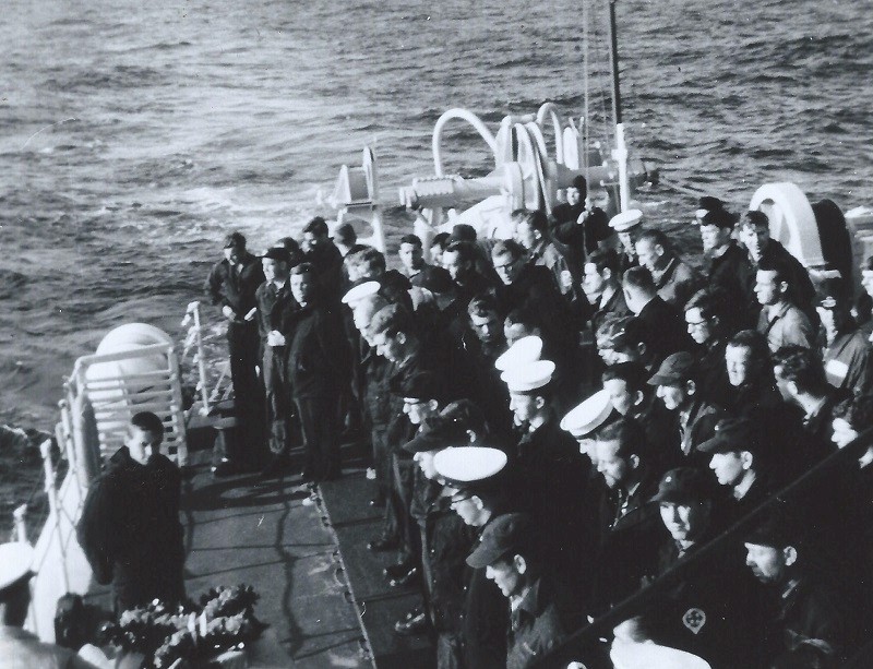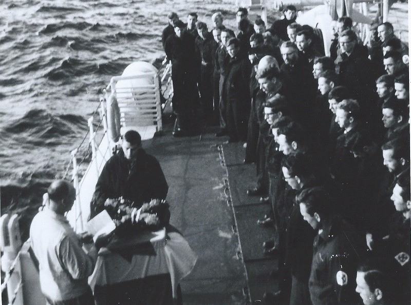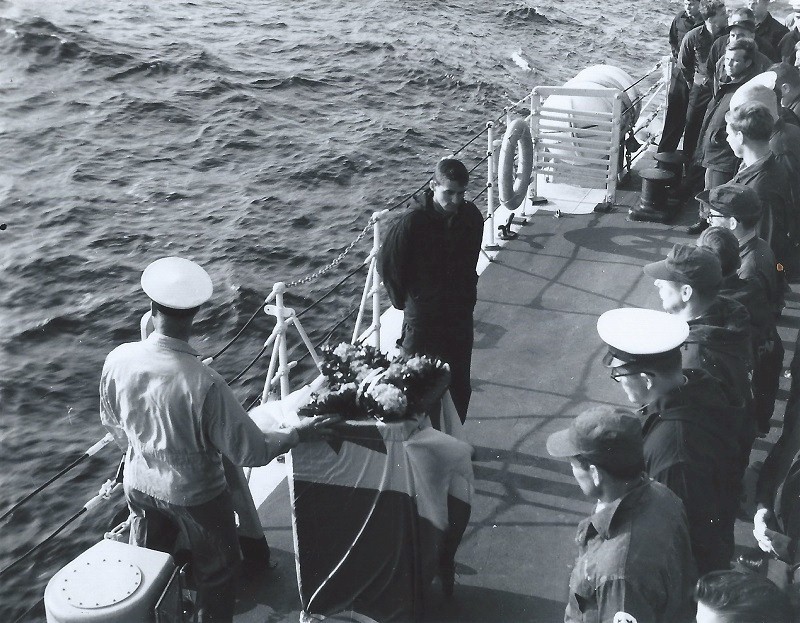 Memorial Service at held at sea for LSWU Wayne Olan (WJO001) Ship's company musters aft (WJO002) Cdr Edwards waits for ships in company to stop (WJO003) Cdr Edwards conducts a Memorial Service for LSWU Wayne John Olan (WJO004) Wreath made by ship's company for LSWU Wayne Olan
